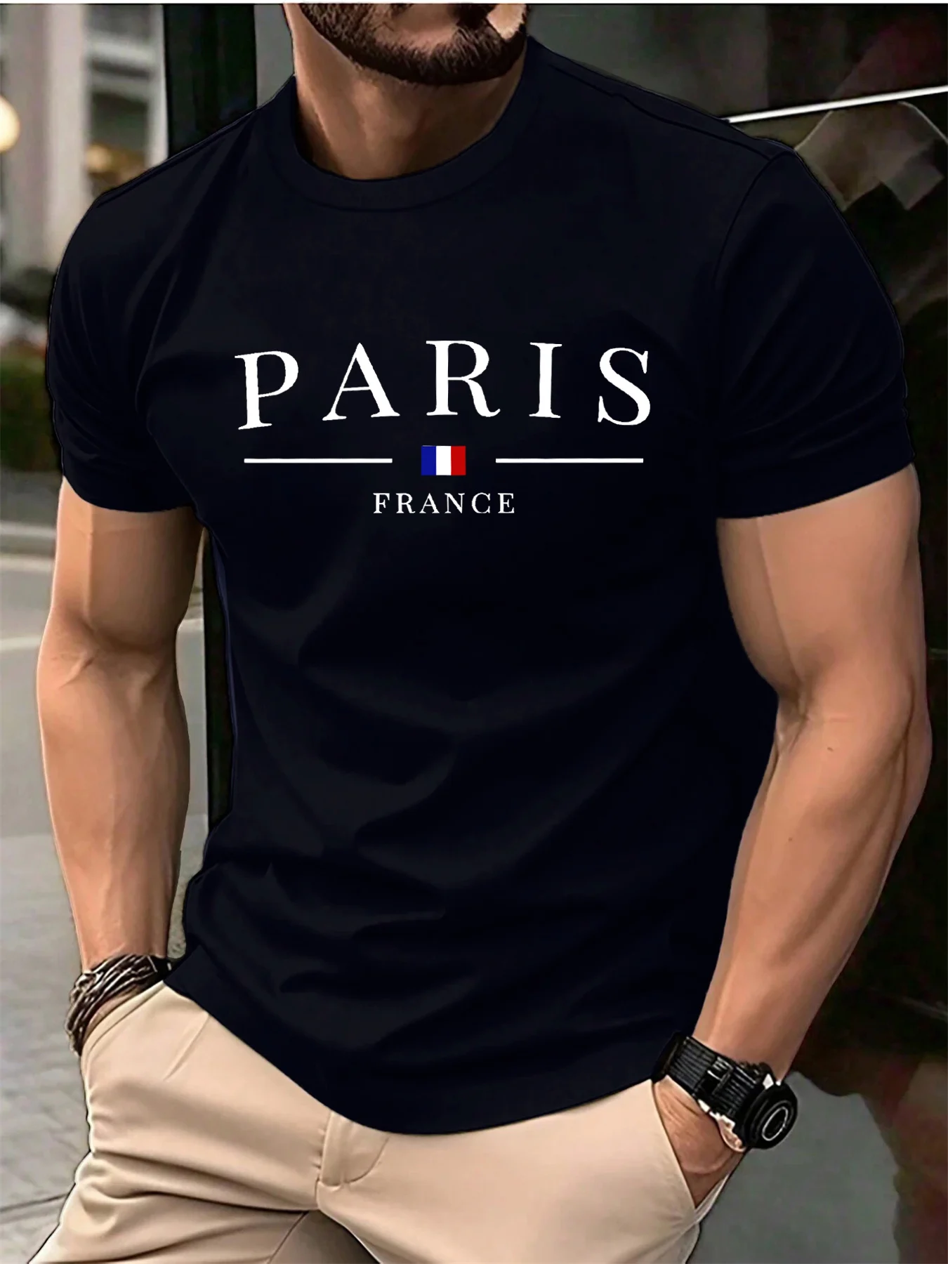 Summer men's 100% pure cotton casual loose plus size Paris French printed sports comfortable round neck short sleeved T-shirt