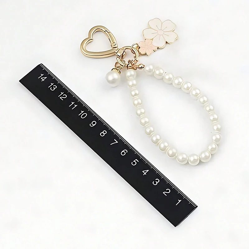 Lovely Cherry Blossoms Fan Keychain Pearl Chain Pendant Women Car Key Ring Headphone Case Charms Bag Decor Accessories