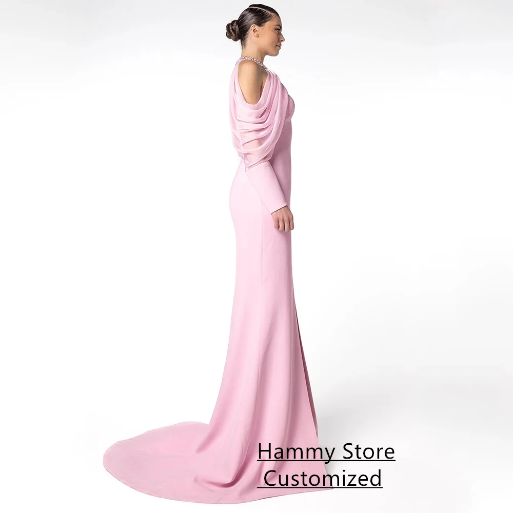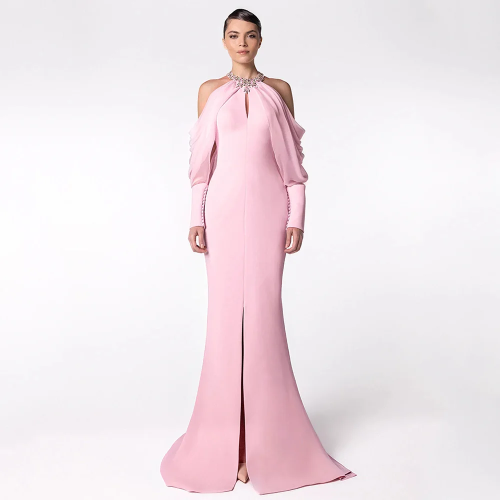 Mermaid Evening Dress Vestidos De Fiesta Customized Halter Long Sleeves Buttons Pink Prom Gown Slit Party Dresses
