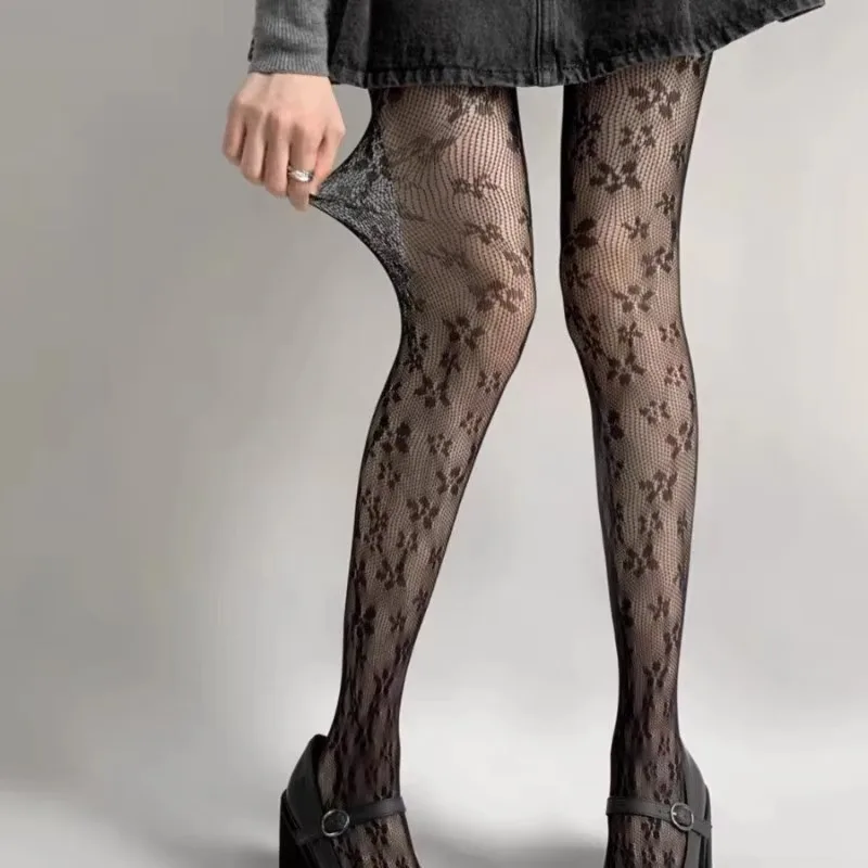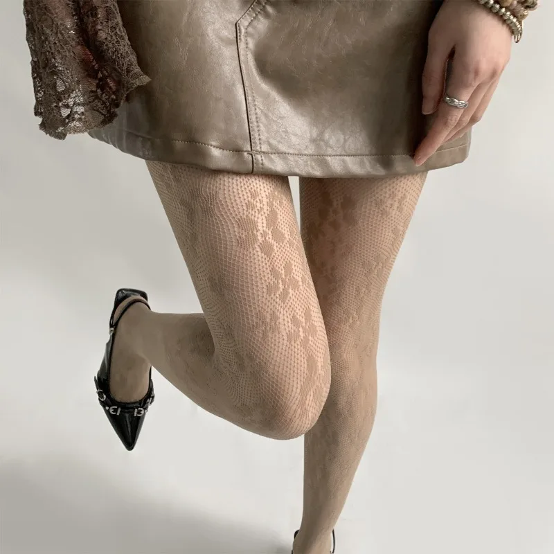 New Floral Pattern Brown Fishnet Pantyhose Women Coffee Hollow Out Mesh Tights Y2k Lolita Nylon Transparent Lace Stockings