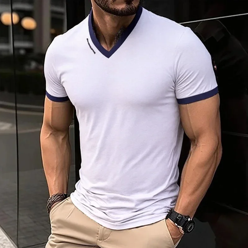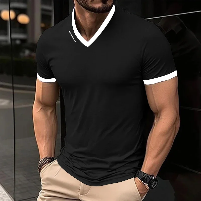 Men's Casual and Fashionable Solid Color V-neck Short Sleeved T-shirt with Letter Print Summer Versatile and Comfortable Top
