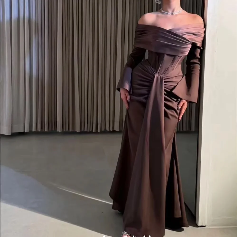 Brown Off the Shoulder Prom Dresses 2025 Satin Long Sleeve Corset Mermaid Pleated Backless Zip Wedding Party Dress Customized