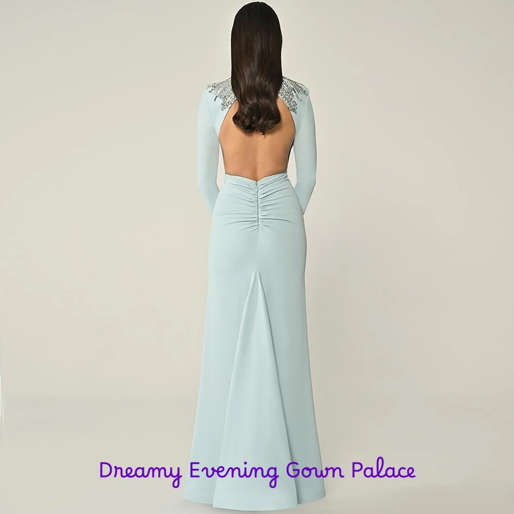 Luxury Blue Jersey Evening Dress Classic High Collar Long Sleeves Celebrity Gowns Delicate Crystal Customized Party Dresses