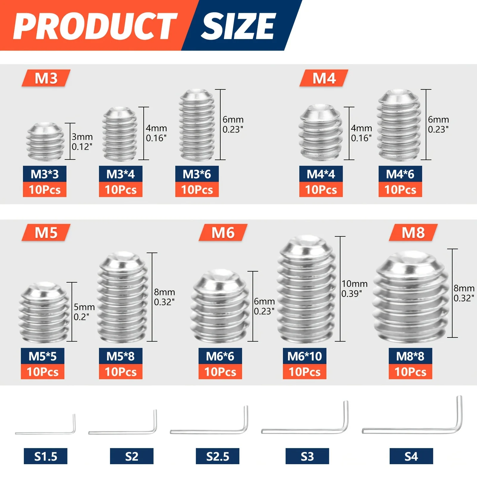 aliexpress , ali , shop , ali shop , online , store , online shop , online store , buy , sell , Set Screws Assortment Kit M3 - M8 with Allen Keys - 100 PCS 304 Stainless Steel Grub Screw for Fixtures Knobs Faucets & More