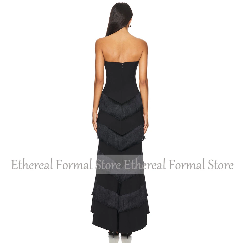 Modern Black Evening Gown Strapless Mermaid Formal Women's Evening Dress Tassel Trumpet Floor Length Party Dress Long