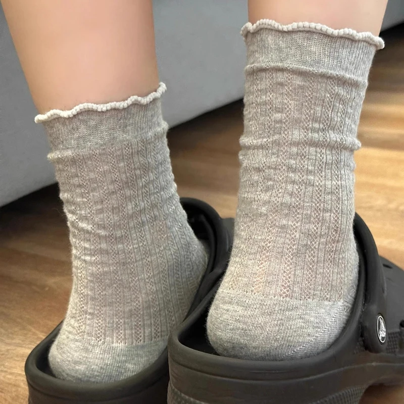 5 Pairs Women Solid Color Mesh Mid Tube Socks Summer Lightweight Breathable Fashionable Wavy Edge Ballet Style Casual Socks