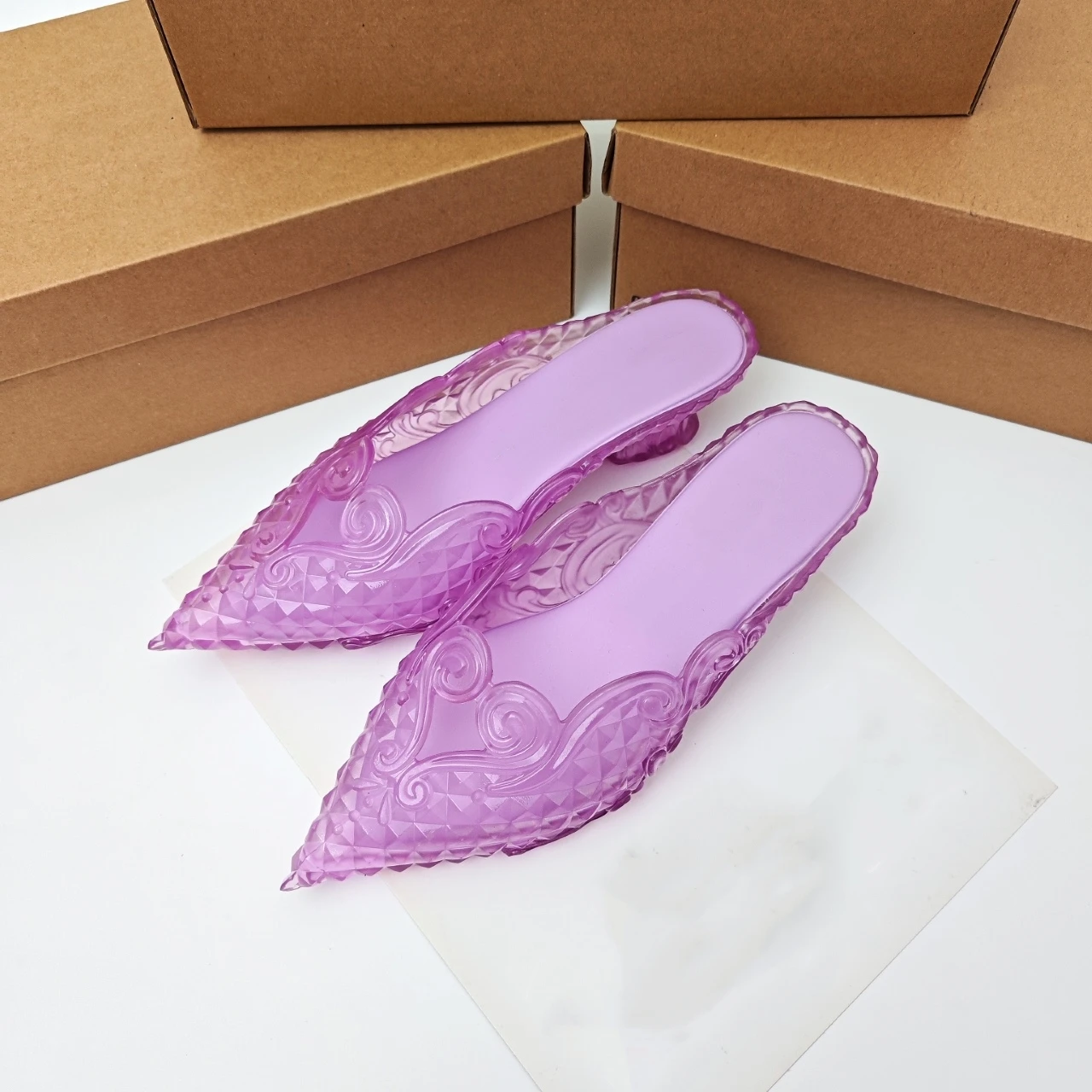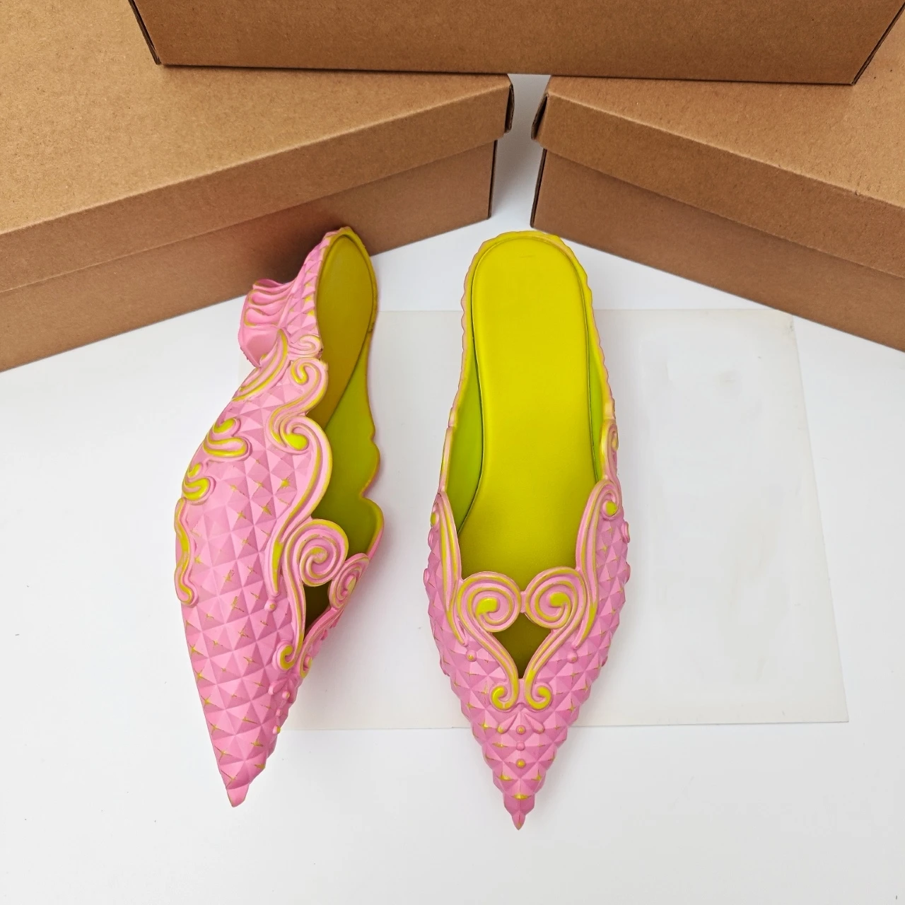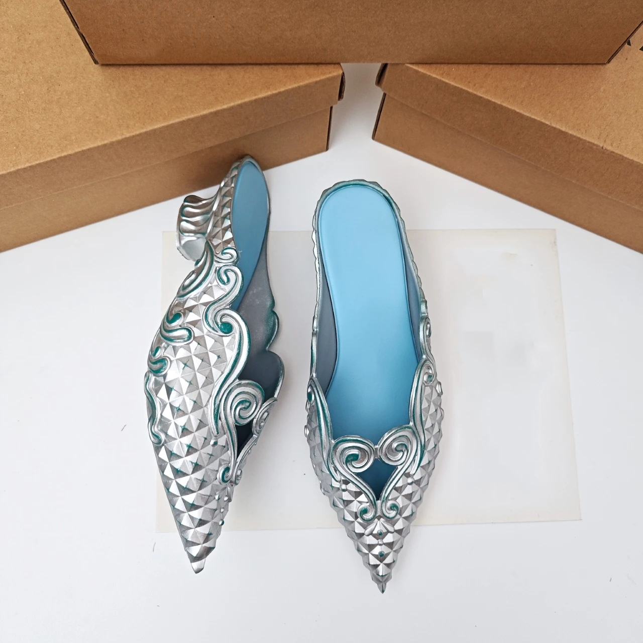 2025 Summer Fashion Design Women's Shoes Embossed 3D Pointed Shoes Witch Shoes Ladies Retro Low Heel Slippers Party Shoes
