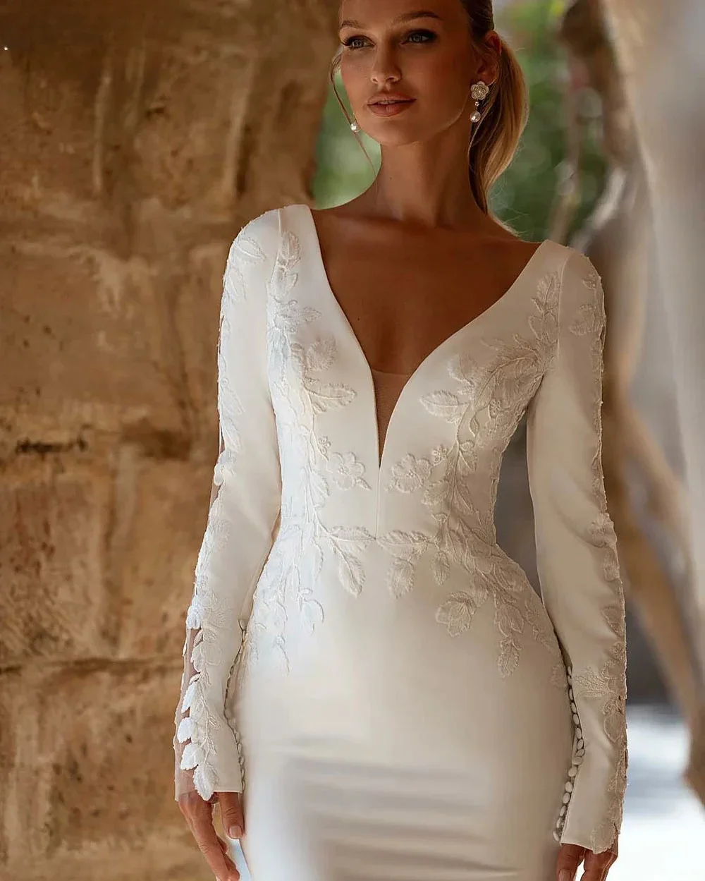 Customized Graceful V-Neck Mermaid Satin Wedding Dresses Long Sleeves Lace Appliques Bridal Gowns Backless Wedding Dress