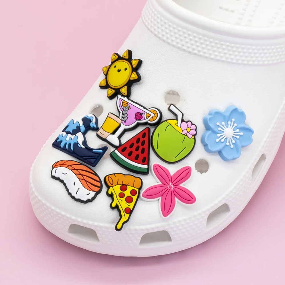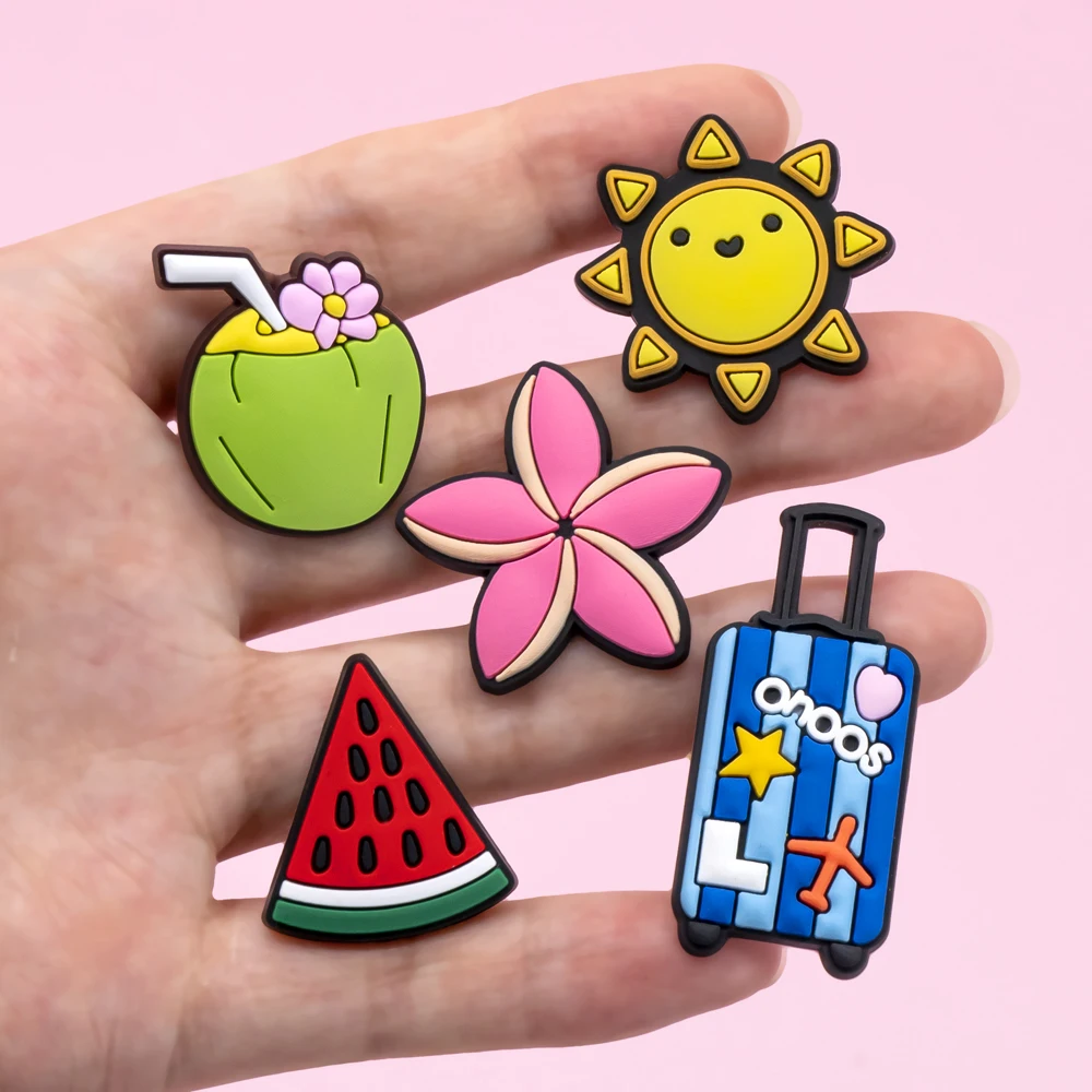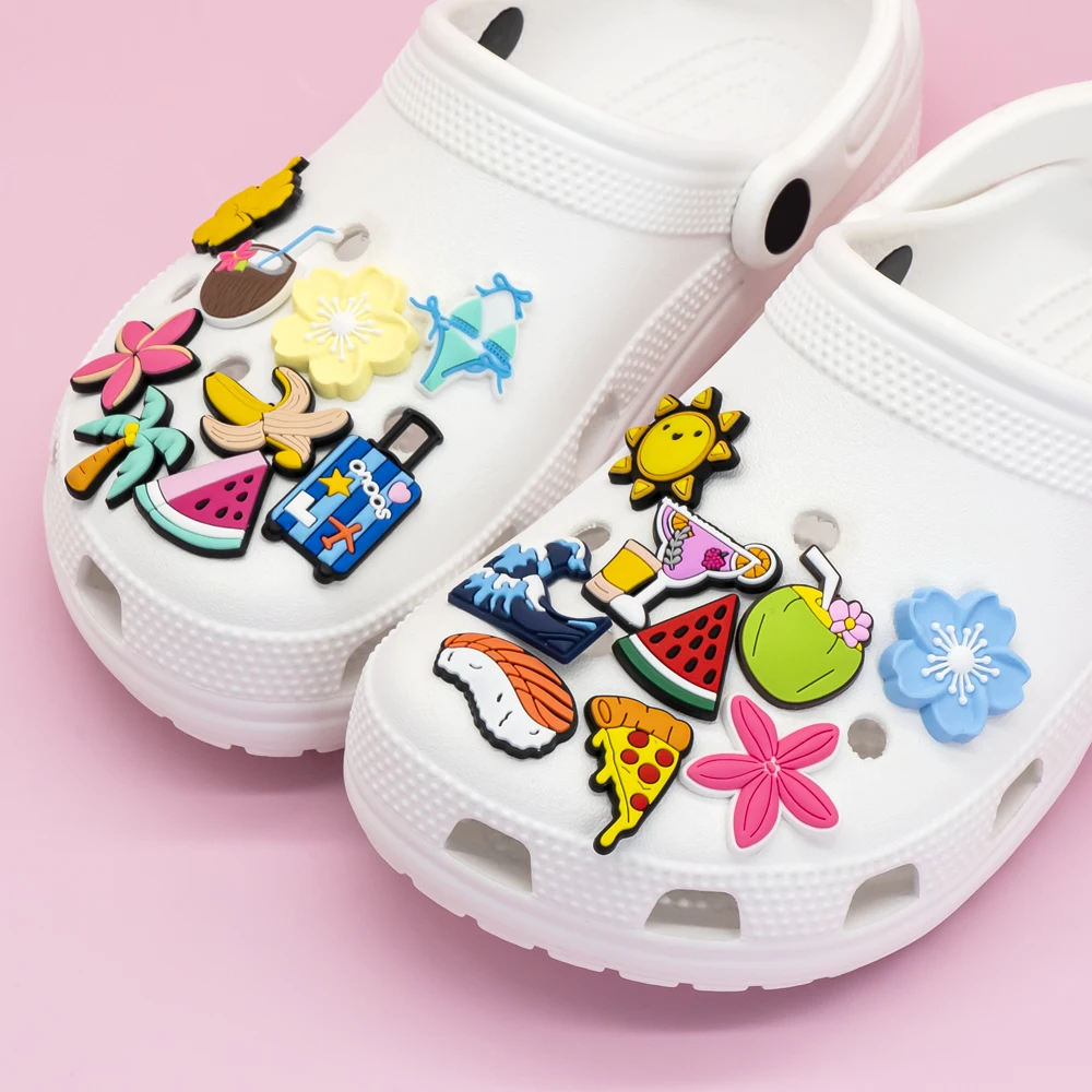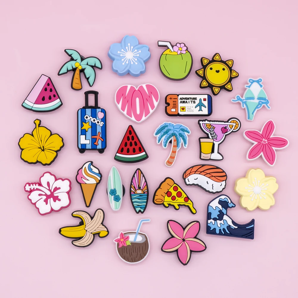1/25pcs Pink Flower Heart Watermelon Shoe Charms Airplane Ticket Luggage Shoe Decoration Pins for Women Pizza Banana Clog Jeans