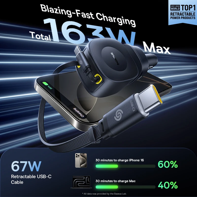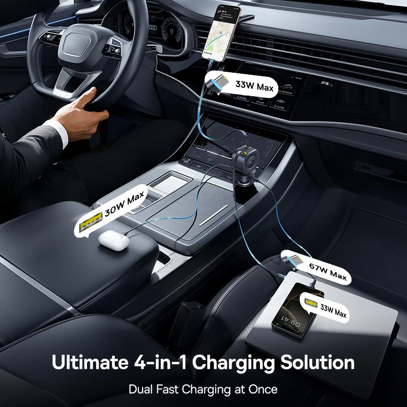 Baseus 100W Car Charger PD QC Fast Charging Dual Type-C Retractable Cable 4 ports 450°Rotation For Laptop Tablet iPhone Samsung