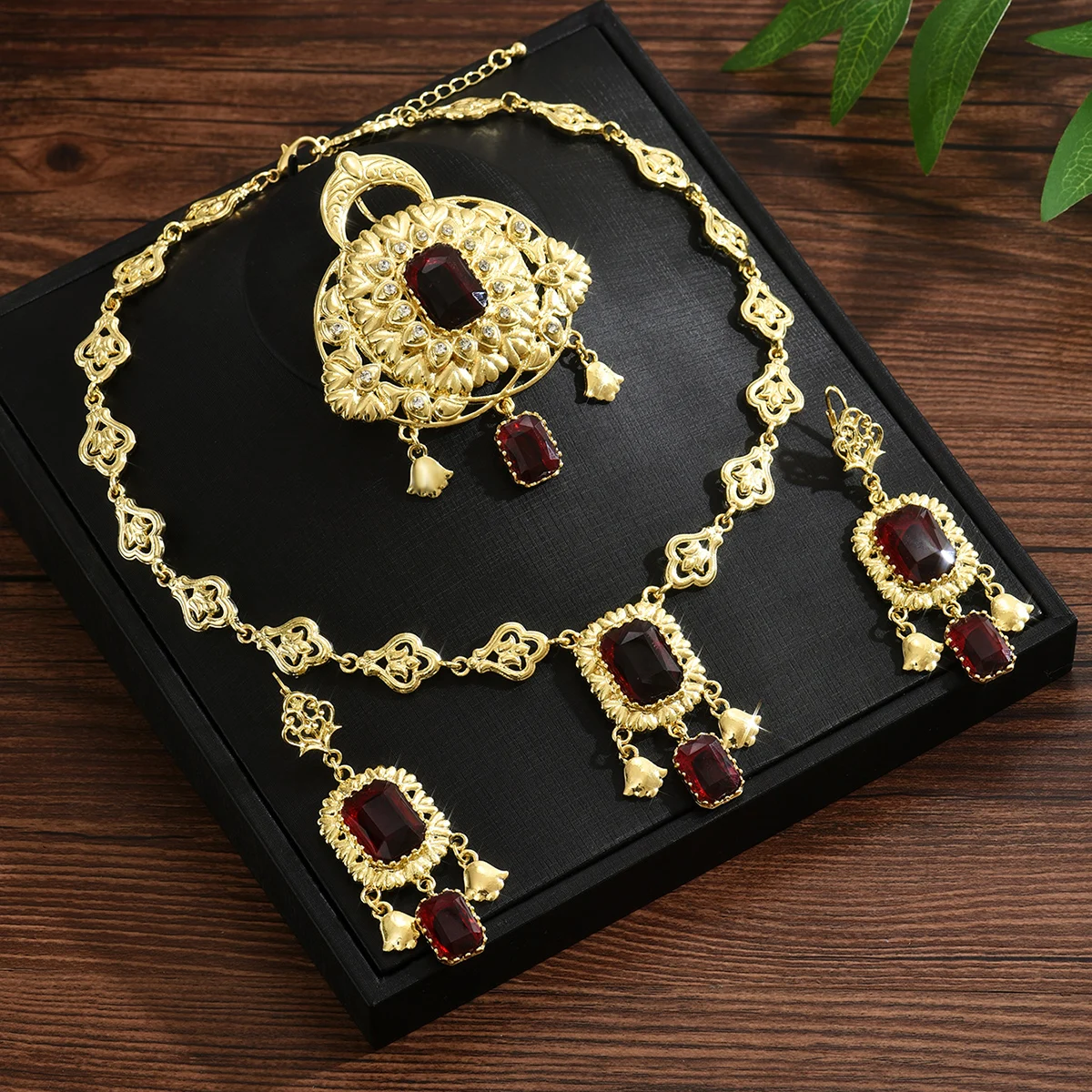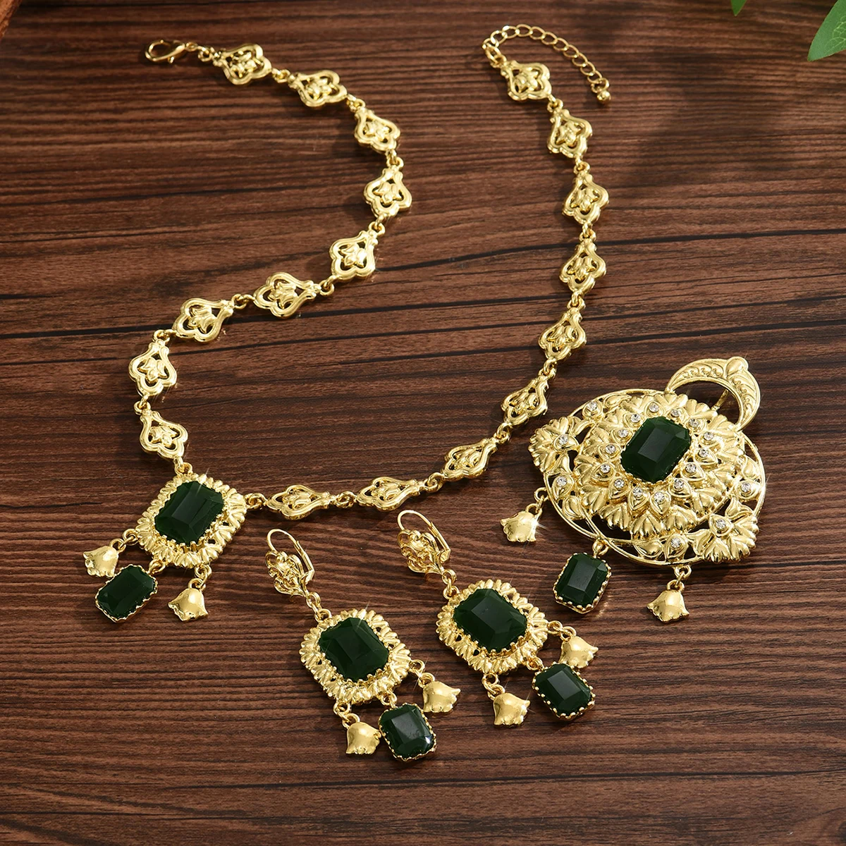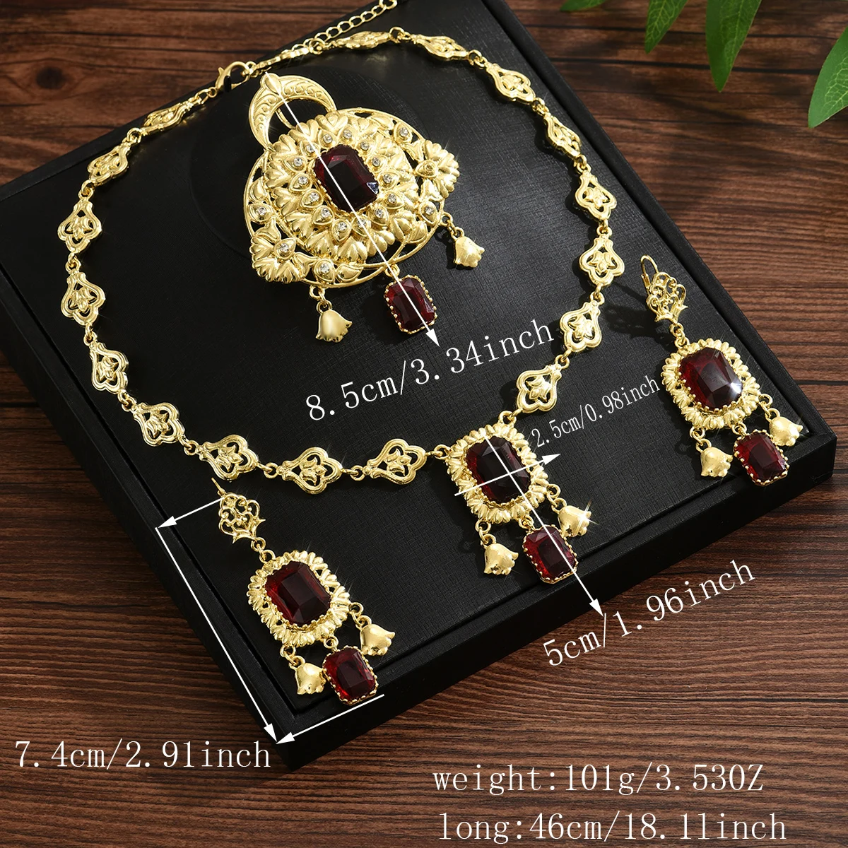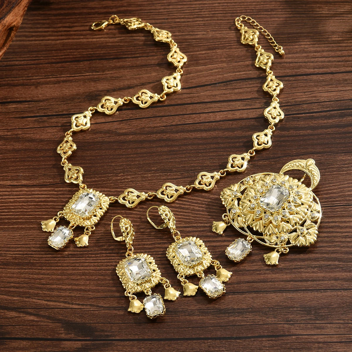 Elegant Moroccan Bride Necklace Head Chain General Earrings Brooch Jewelry Set Square Design Arabic Wedding Robe Accessory Gift
