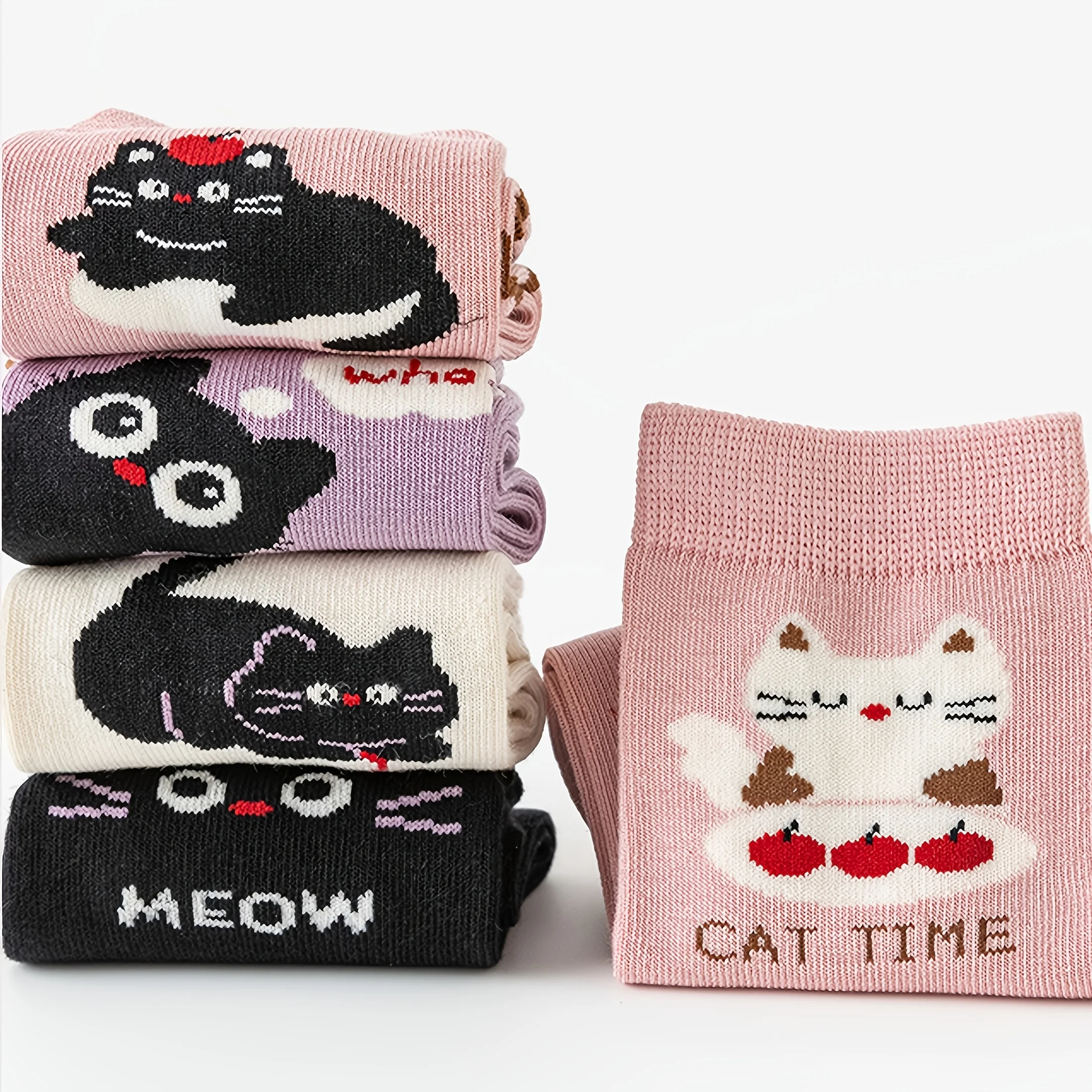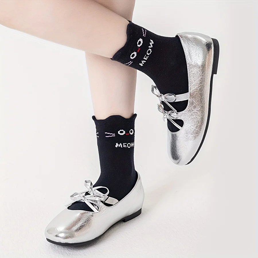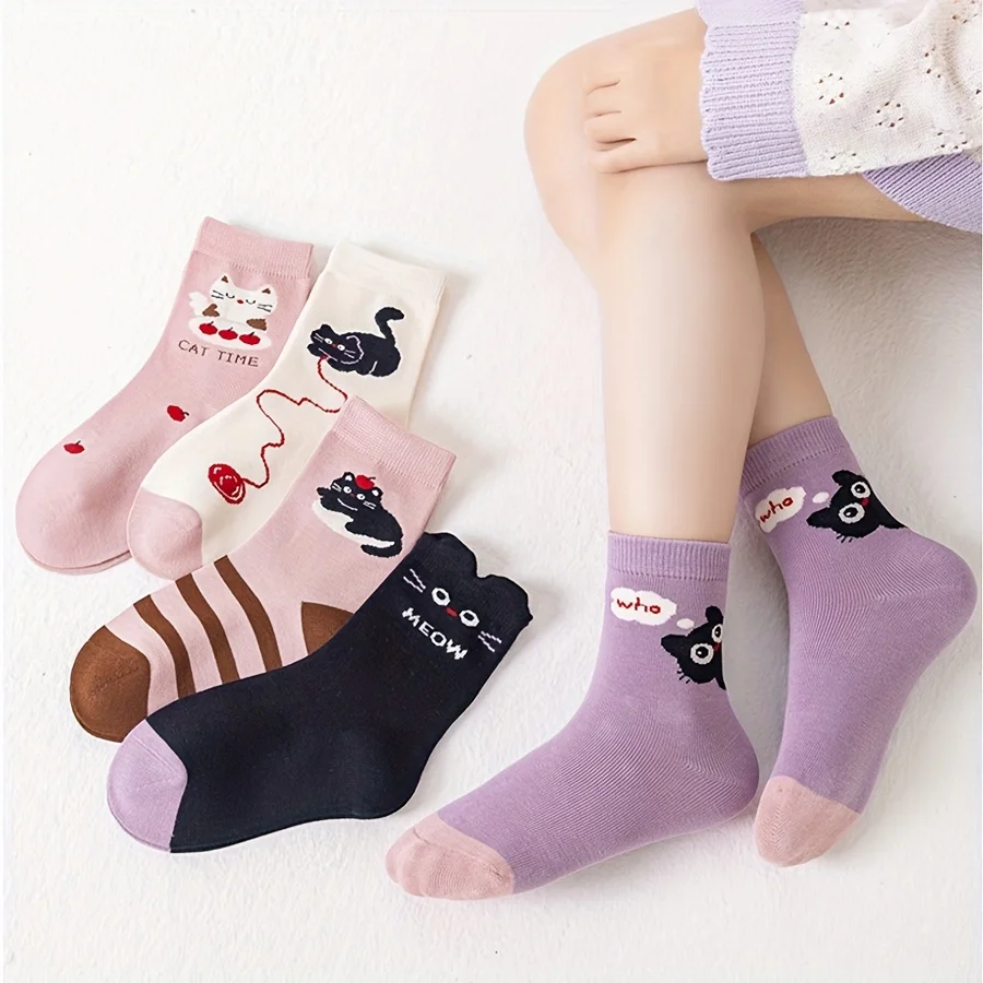 5 Pairs of Kidsren's Socks Cartoon Cute Kitten Stripesd Pattern All Year Round Baby Boy and Girl Color Matching Cat Mid-Calf Socks Suitable for Daily Life