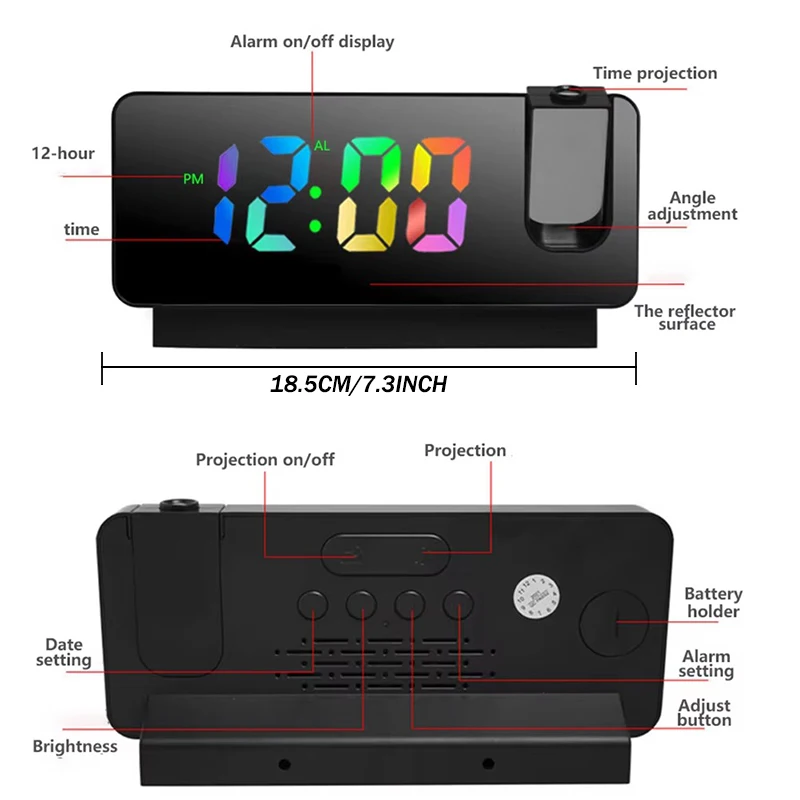 Projection Alarm Clock Desk Clock with Large Color LED Display Rotatable Ceiling/Wall Projector for Bedroom Office Bathroom