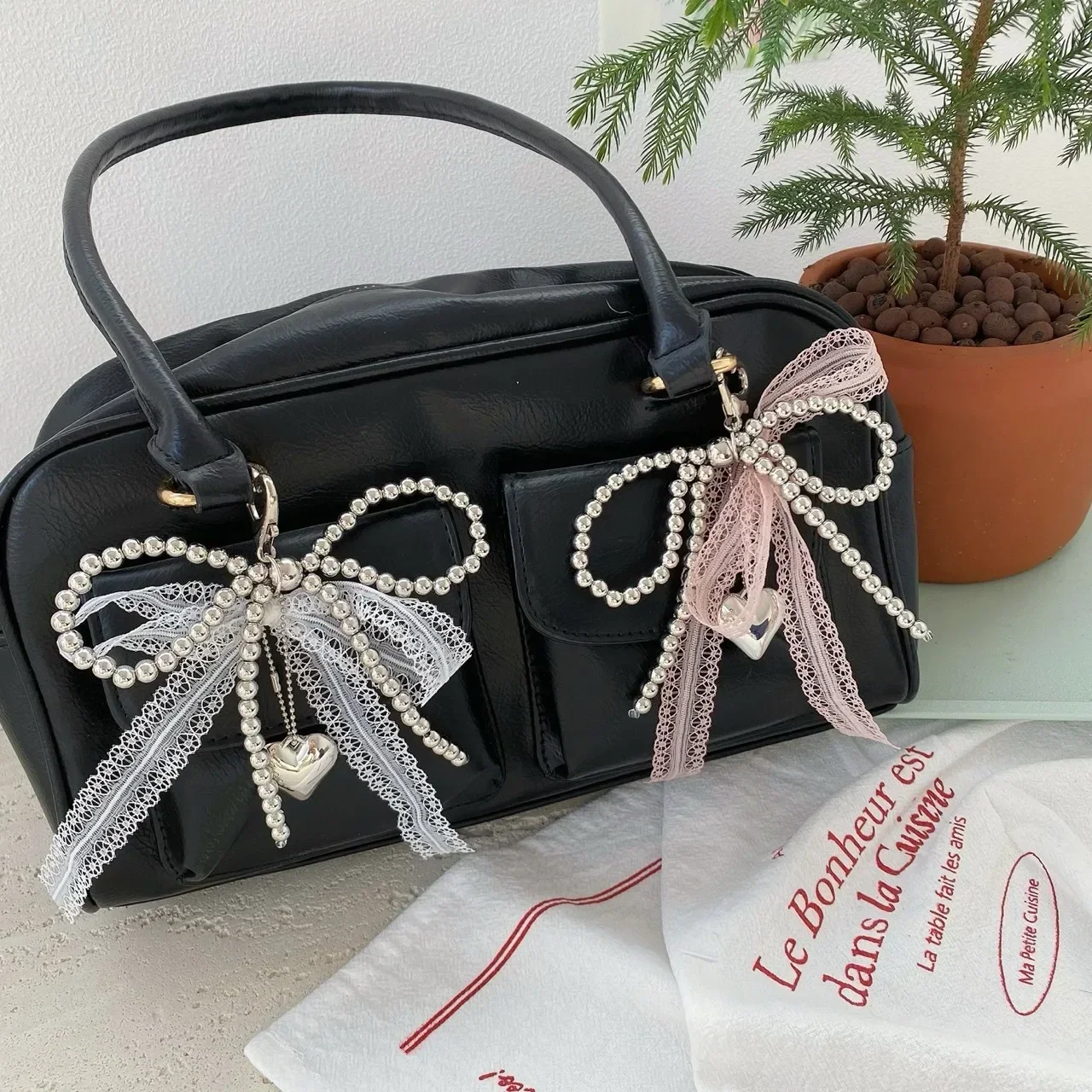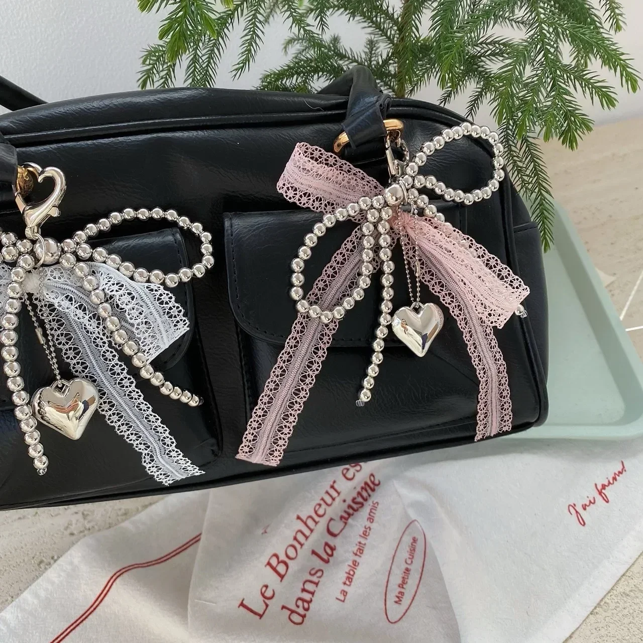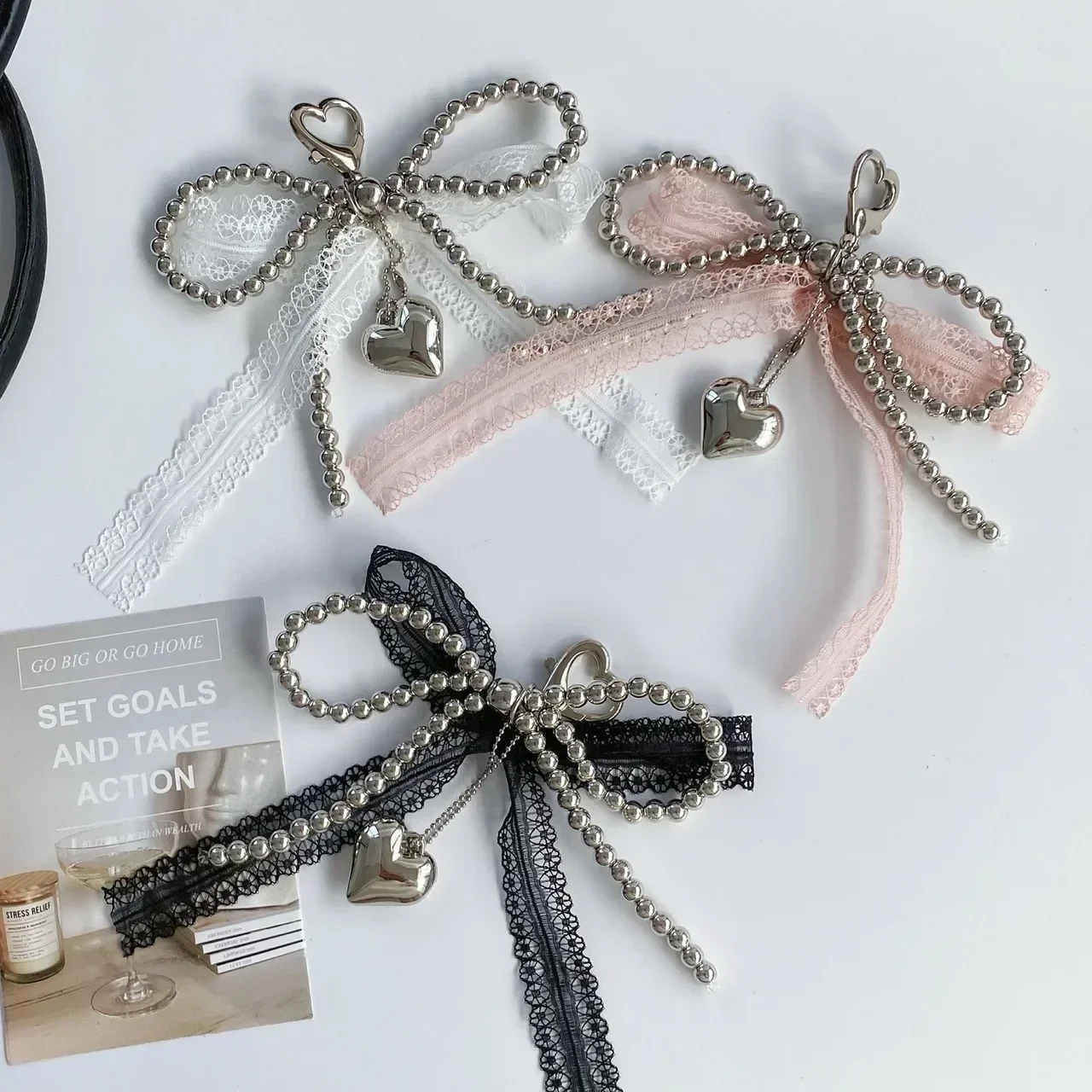 Imitation Pearls Lace Bowknot Keychain Sweet Beaded Pendant Keyring for Women Handbag and Backpack Key Chain Exquisite Ornament
