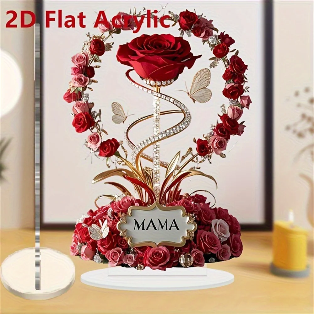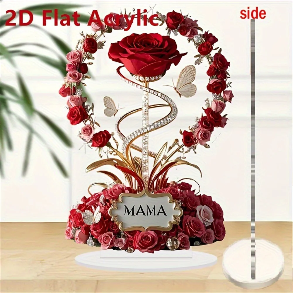 1 Piece 2D Acrylic Ornament Red Rose MOM Pattern with Roses Mother Engraving Mother Elegant Desk Decoration Mother's Day Gift