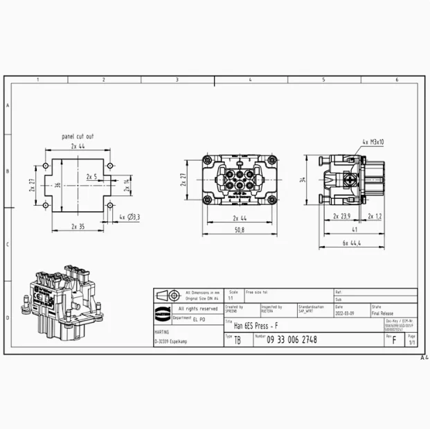 1pcs 09330062748 Germany Harding Heavy Duty Connector Han6ES Press-m 16A 600V male core