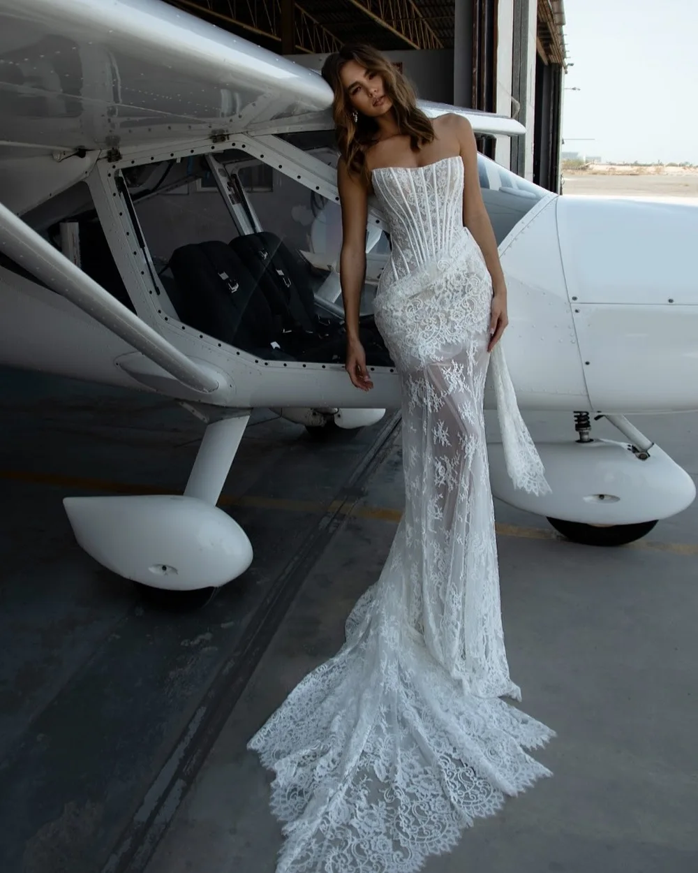 Kyoto Customized Pleated Lace Flower Sheath Wedding Dress Strapless Detachable Train vestidos de novia Exquisite Evening Dresses