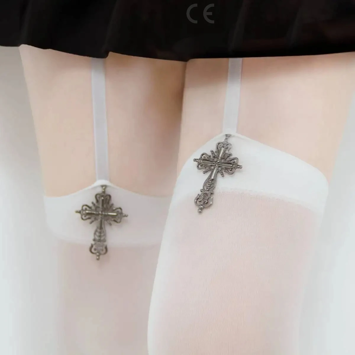 1/2pairs Gothic Cross Decoration Tight for Women Stockings Solid Color Thin Thigh High Lolita Over Knee Stockings