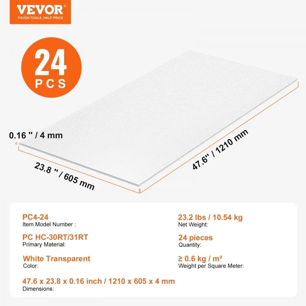 24 Pack Polycarbonate Greenhouse Panels 2x4 Feet Durable Roof Sheets Clear UV Resistant Lightweight Garden Covering
