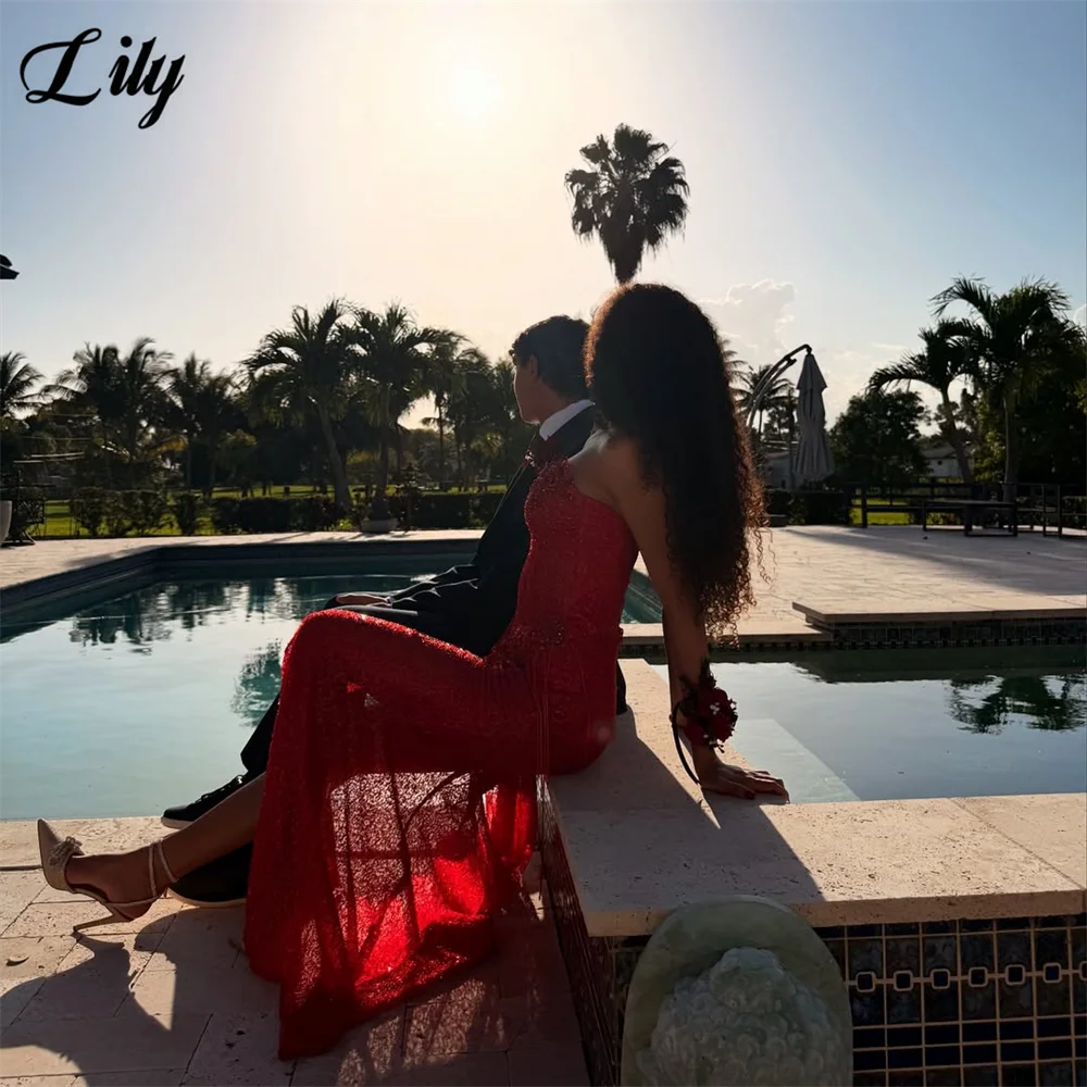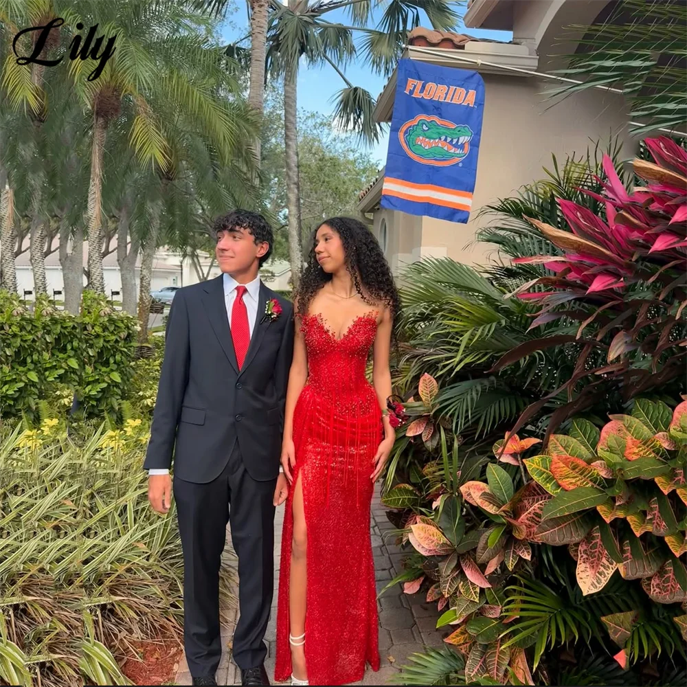 Lily Red Formal Dress Shiny Sequined Deep V-Neck Evening Gown Bead-Embellished Fringe and Side Split Prom Dresses Customized