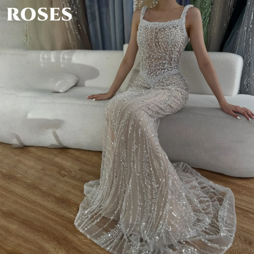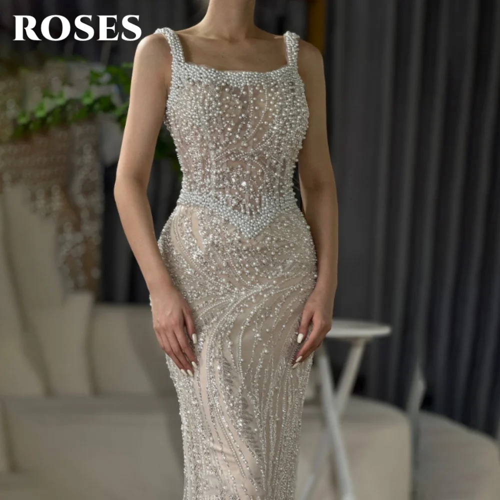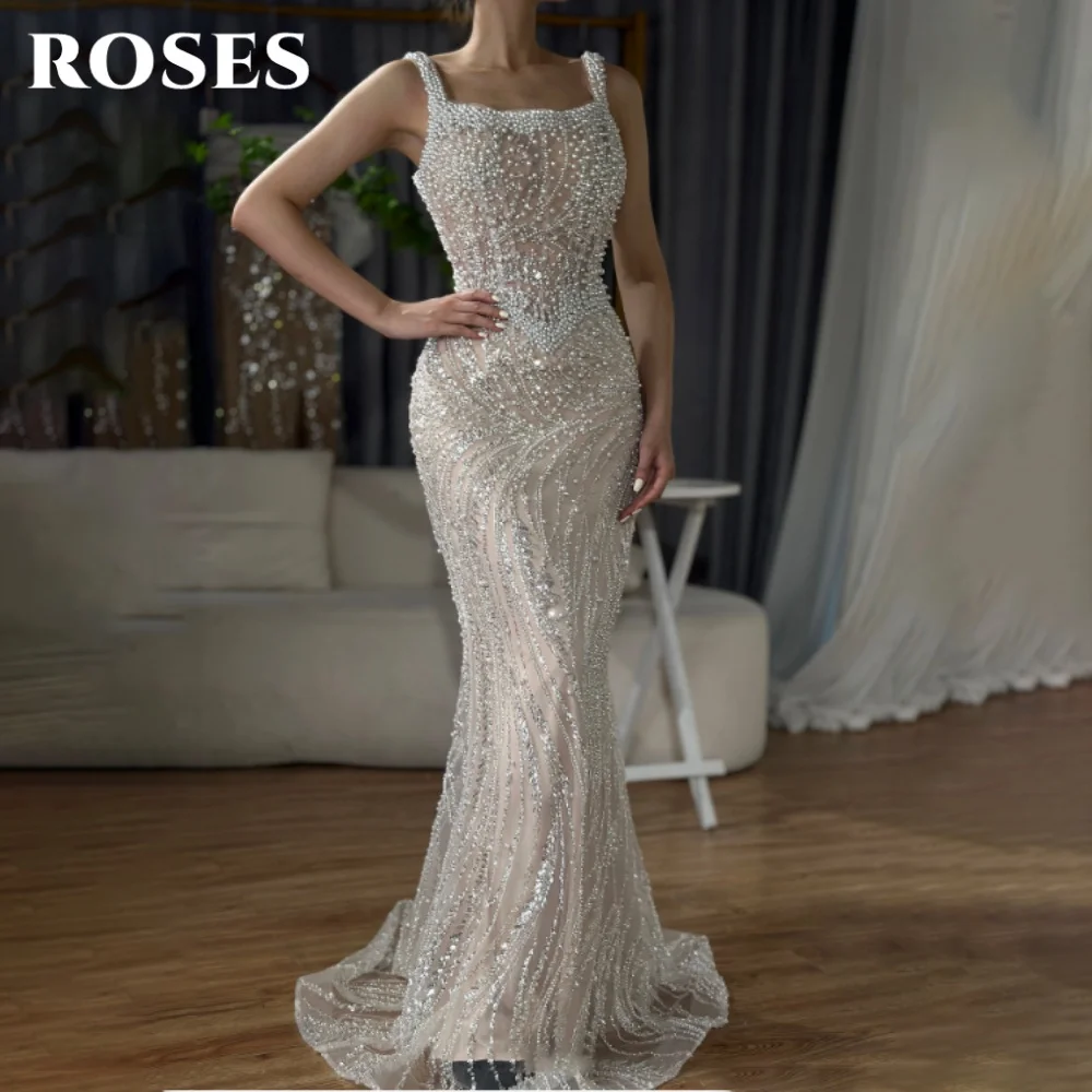 ROSES Champagne Elegant Evening Gown Square Pearl Shoulder Strap Prom Dress Gorgeous Lace Mermaid Evening Dresses Customized