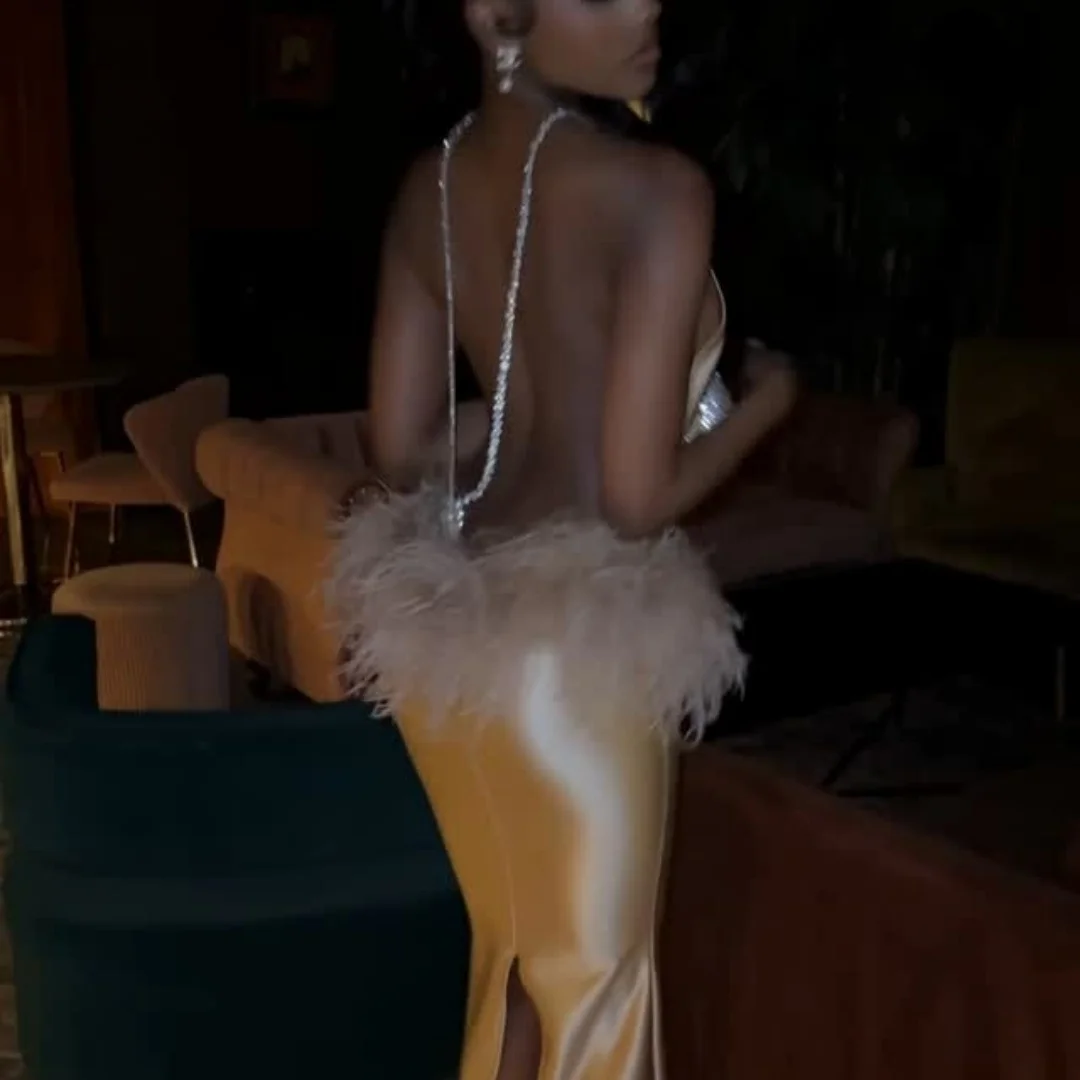 Sansa Customized Golden Halter Neck Prom Dresses Feathers فساتين للمناسبات الخاصة Mermaid Satin Floor-Length vestidos de festa