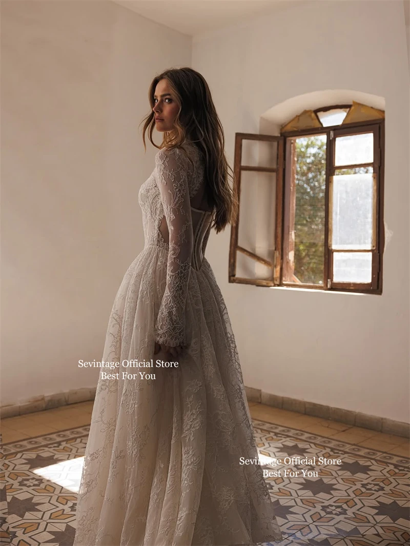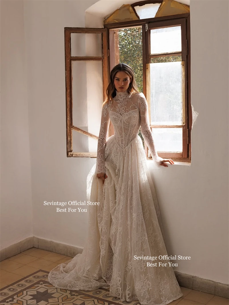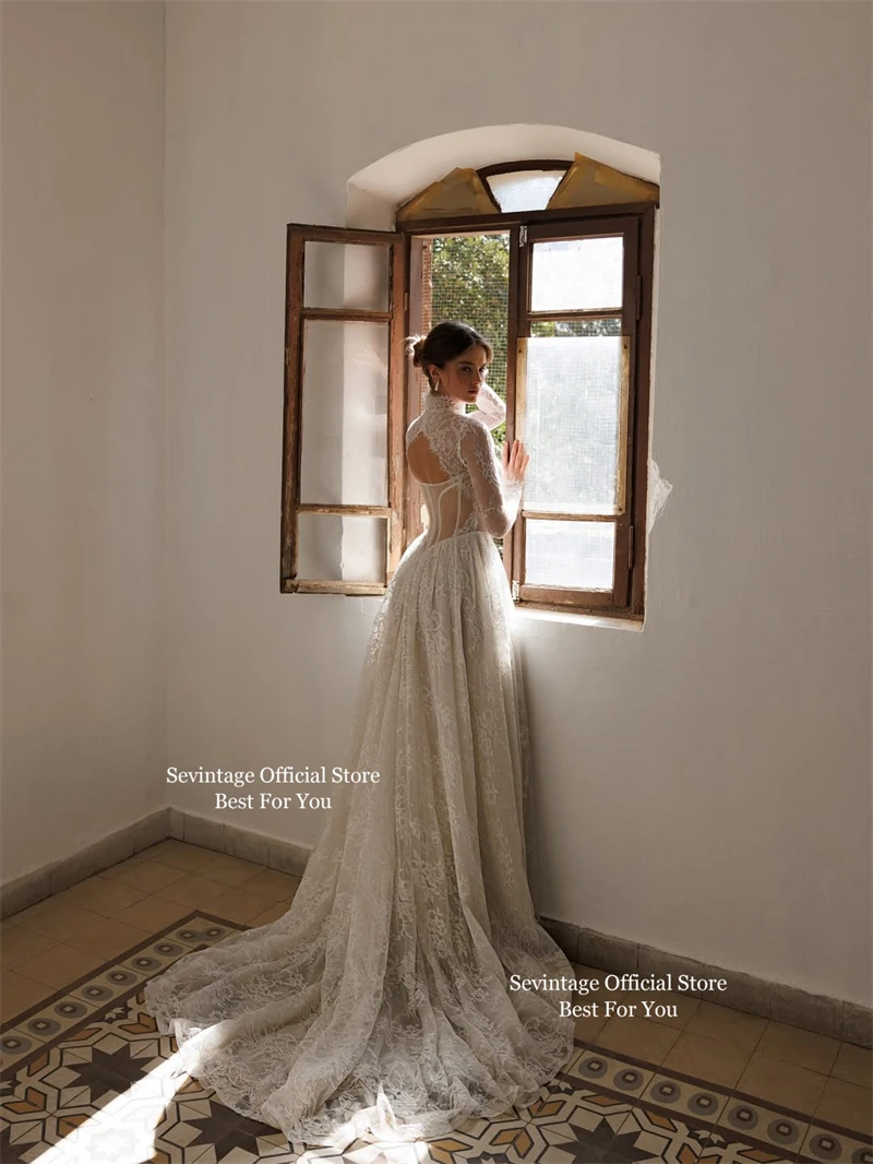 Sevintage Full Lace Ivory Wedding Dresses High Collar Long Sleeves Bridal Gowns Floor Length A-Line Wedding Gowns 2025 Customize