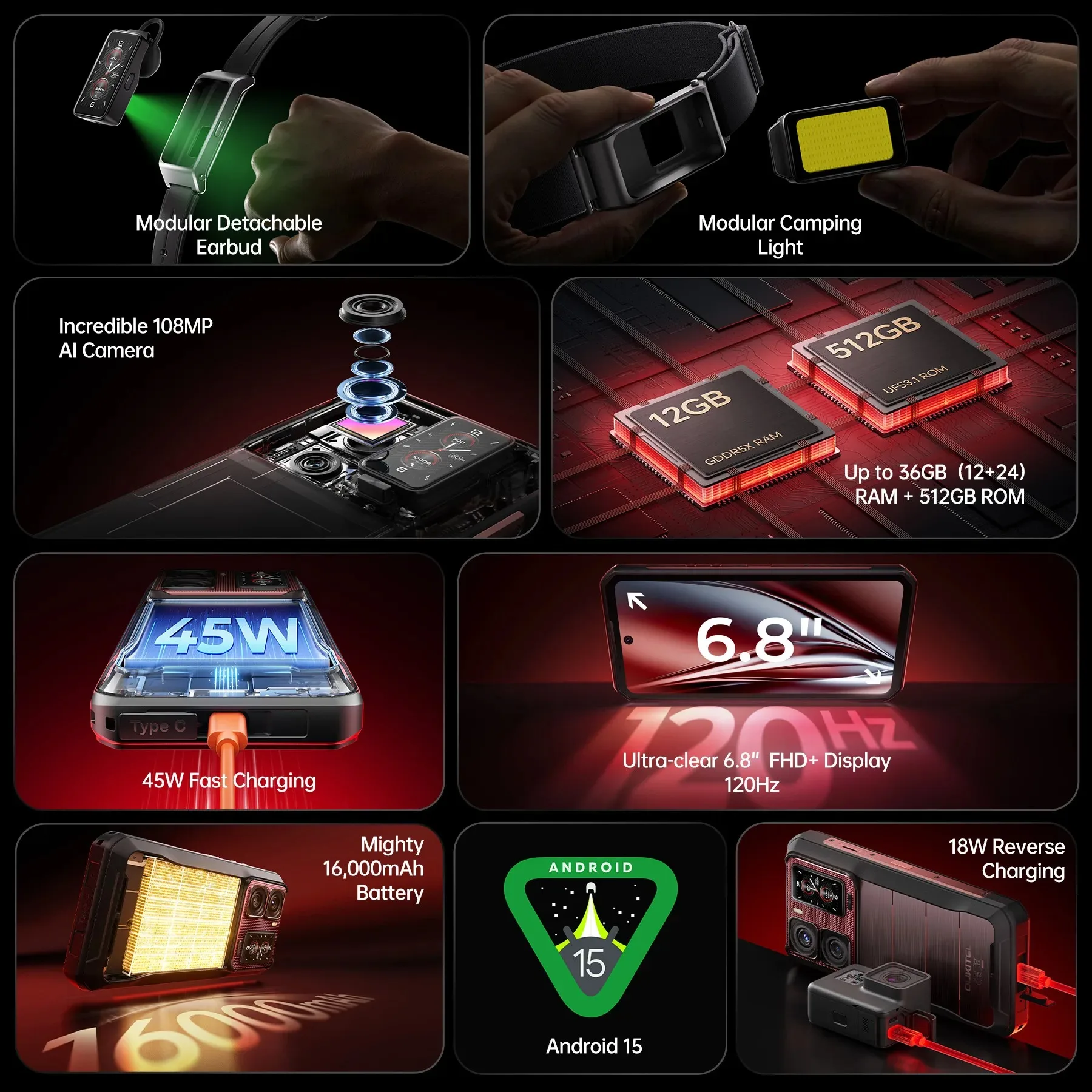 Oukitel WP300 Rugged Phone 16000mAh 36GB(12+24)GB+512GB Modular detachable Earbud/camping Light 6.78'' FHD 120Hz 108MP Cell pho