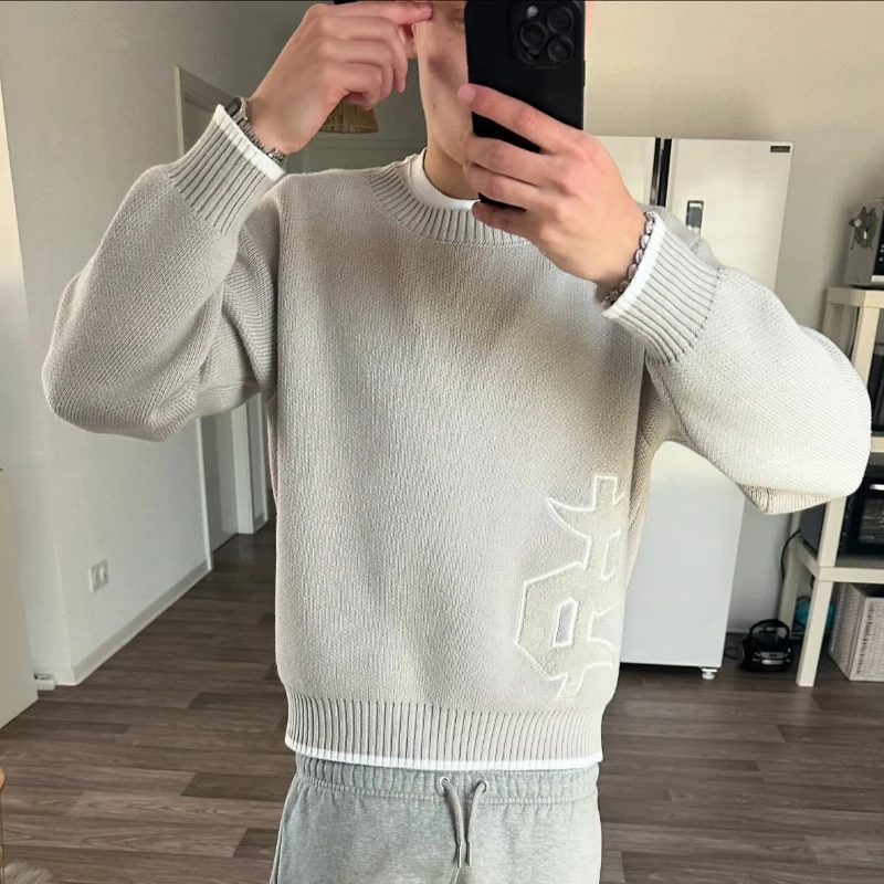 Y2K Round Neck Gray Knitted Sweater New Popular Symbol Pattern Retro Harajuku Pullover Autumn Winter Warm Boxy Men's Clothing