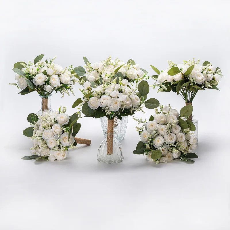 White Bridesmaid Bouquet Handmade Rose and Eucalyptus Leaves Wedding Bouquet Flowers for Bridesmaids Bridal Wedding Accessories