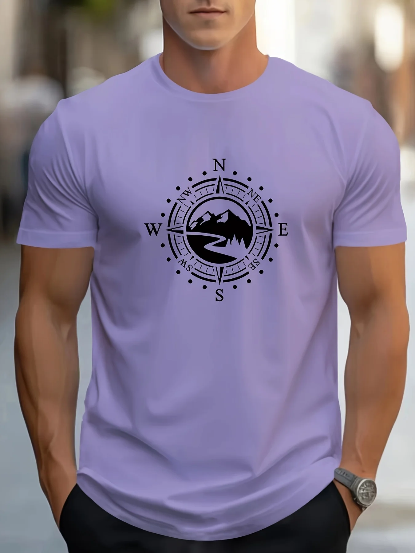 Summer Men's 100% Cotton Casual Loose Large Compass Pattern Printed Sports Comfortable Round Neck Short Sleeve T-shirt Top