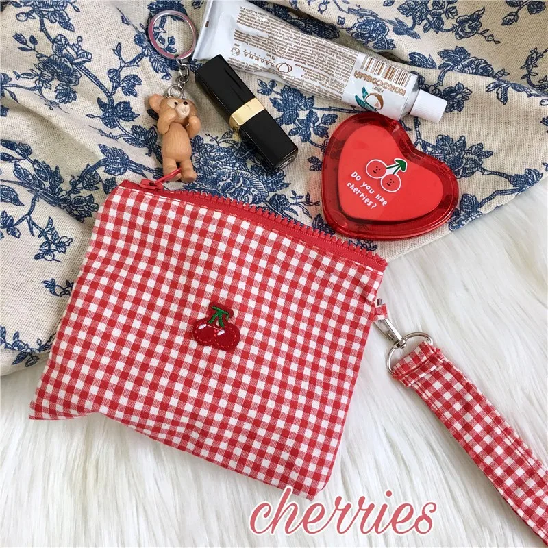 Red cherry canvas makeup bag, portable and easy to carry. Red plaid, large capacity cosmetic lipstick storage bag