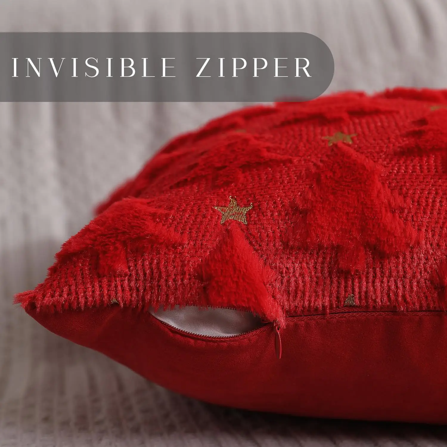 Christmas Tree Plush Faux Fur Pillow Covers 18x18 Inch Soft Winter Decor for Sofa Couch Bed Living Room, White Red Green