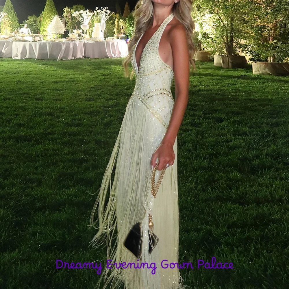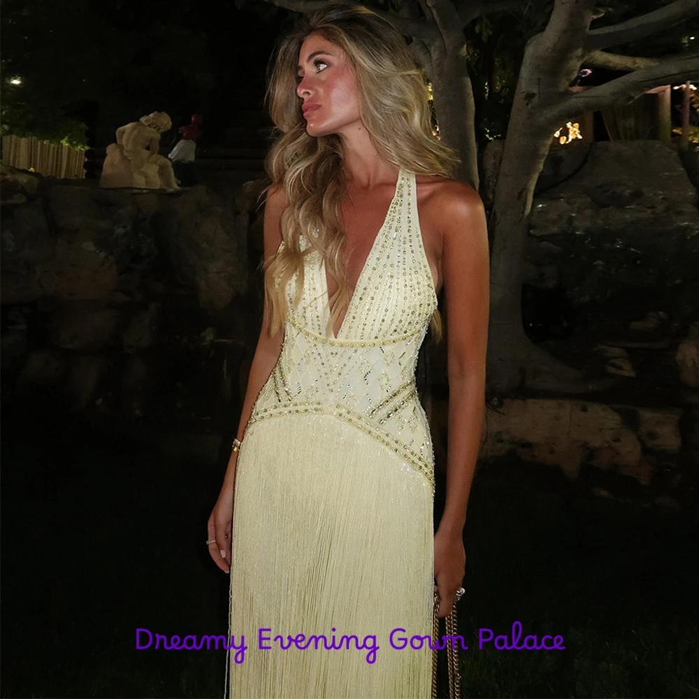 Exquisite yellow Tassel Evening Dress Halter Backless Customized Prom Dresses Delicate Sequined and Beading Celebrity Gowns
