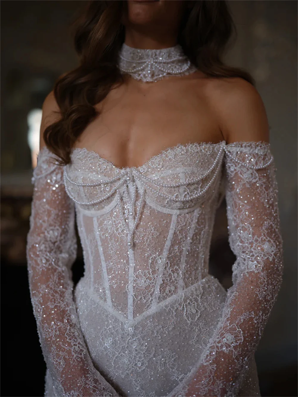 Amanda Customized Off Shoulder Mini Lace Embroidery Wedding Dresses Illusion Beaded vestidos de noche Long Sleeve Formal Evening