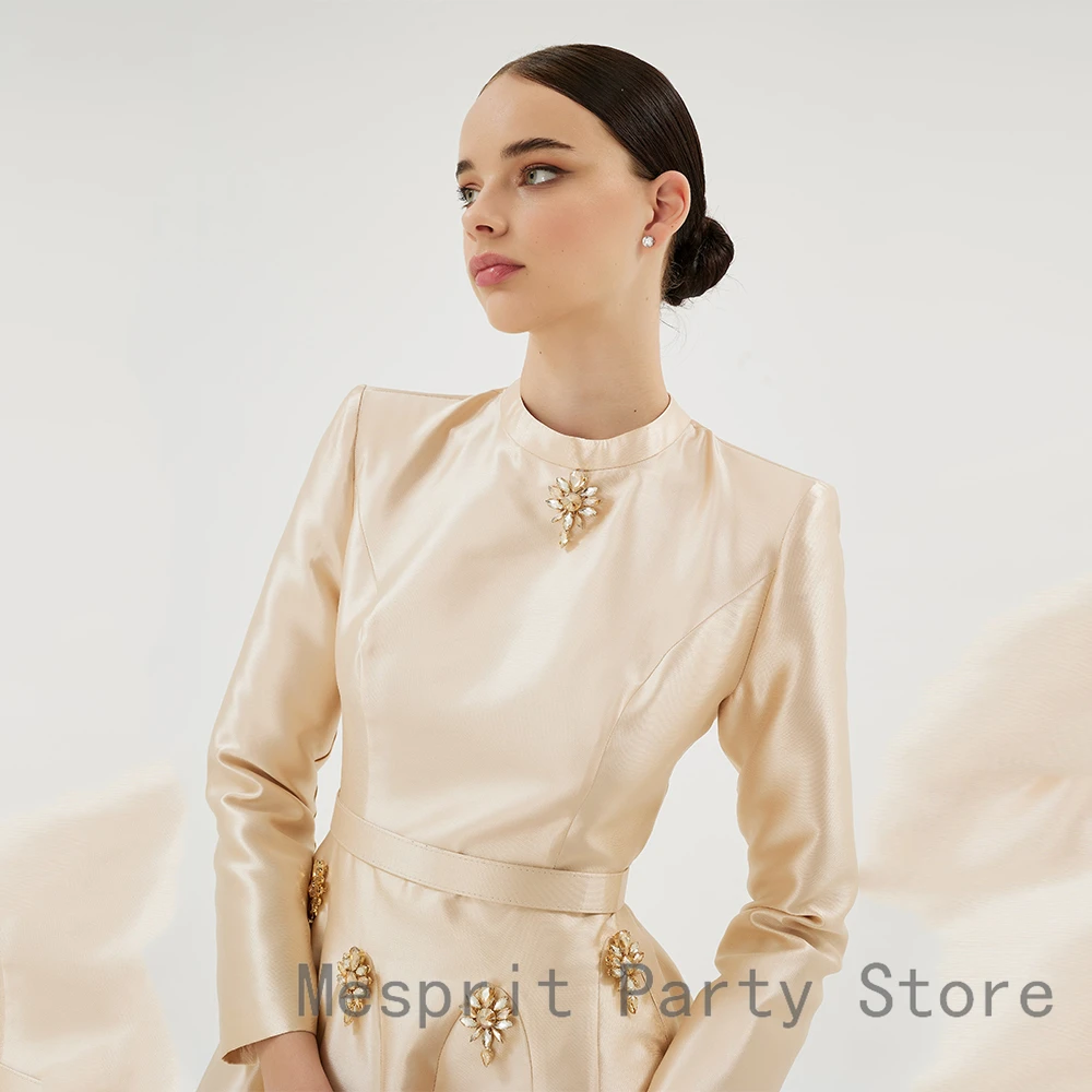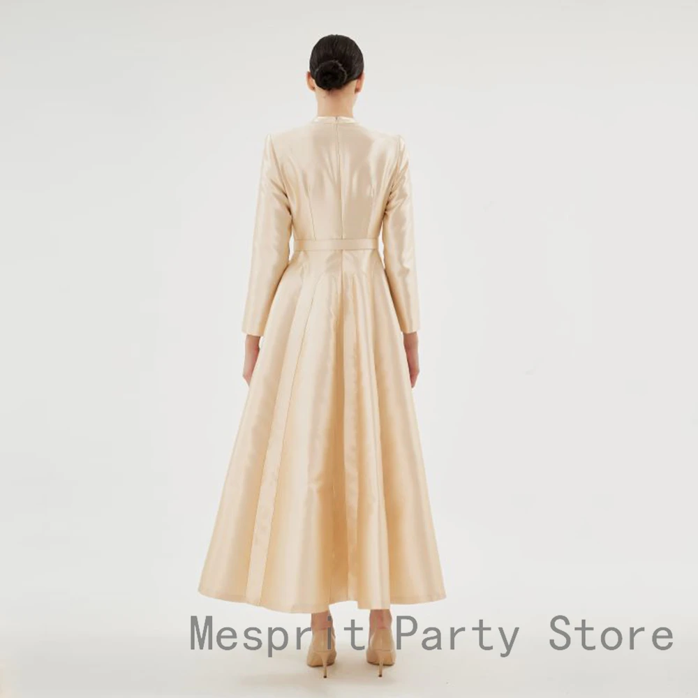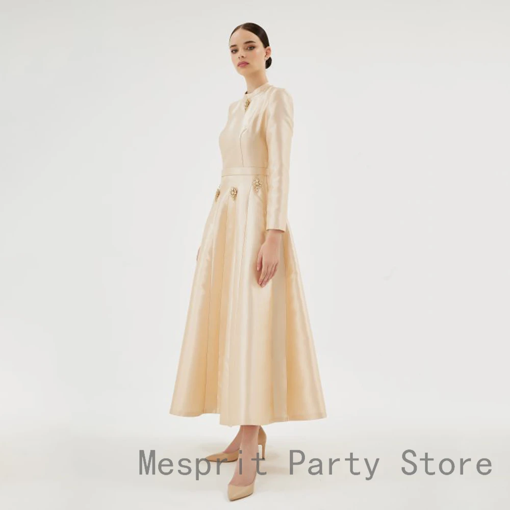 A Line Satin Evening Dress Long Sleeves Saudi Arabia Dress Ankel Length Prom Dress Beading Long Formal Party Gown