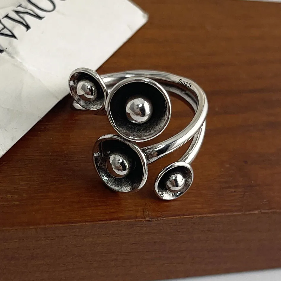 925 Sterling Silver Rings For Women Geometric Fine Jewelry Finger Adjustable Simple Retro Flower Ring For Party Birthday Gift
