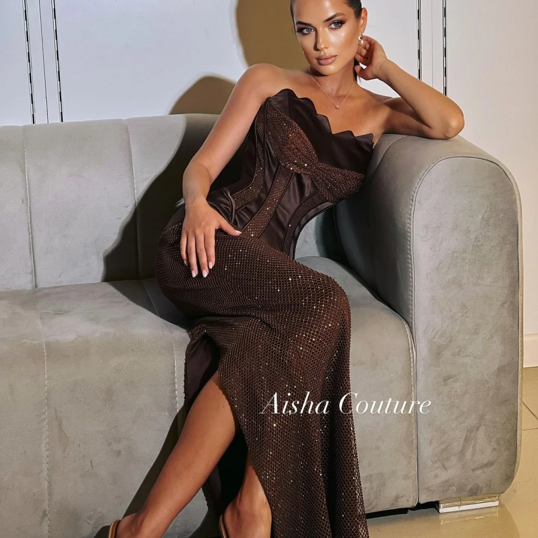 Bella Customized Brown Sequins Strapless Backless Sleeveless robes de soirée Two-Piece Set Party Dresses Side Slit Prom Dress