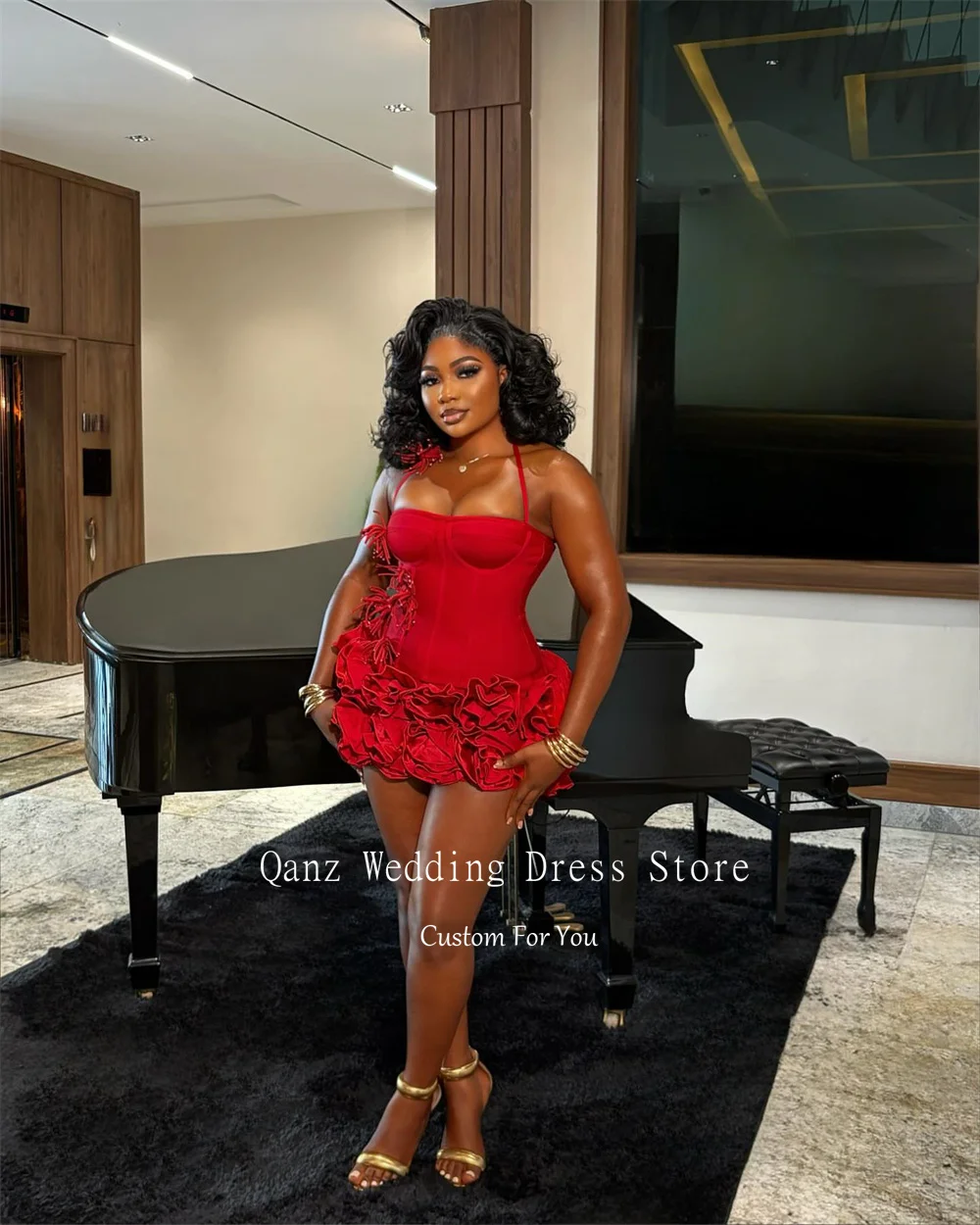Qanz Red Birthday Dresses Baddie Black Girl Halter Neck Mini Prom Dresses Sweertheart Ruffles Wedding Party Dress Customized