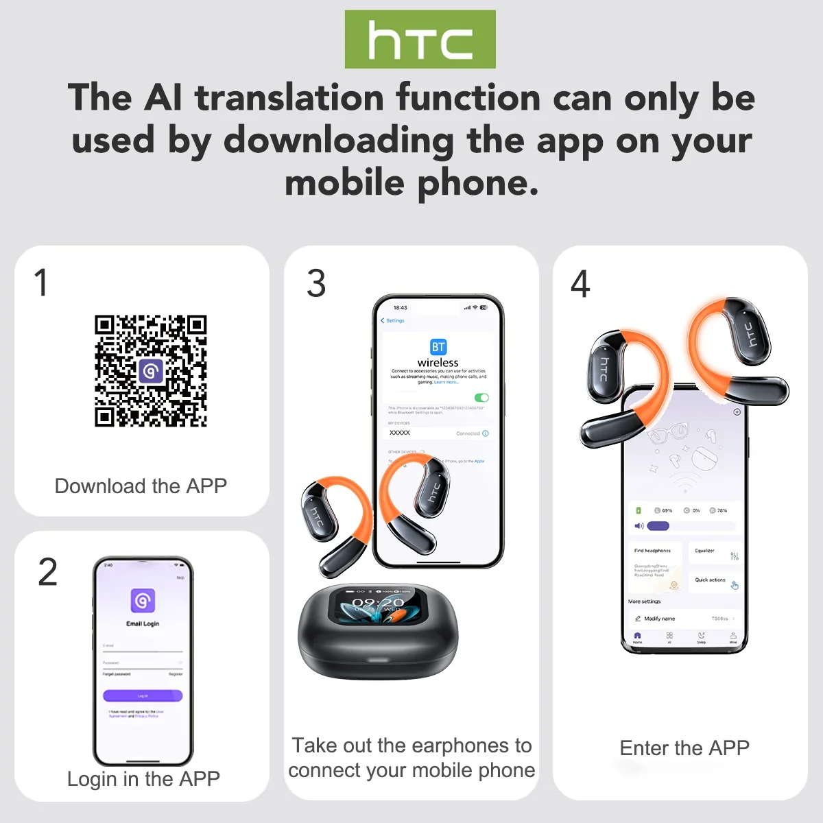 HTC NE27 Wireless Headphones AI Translator Earbuds OWS Sports Bluetooth Earphones Glowing Earhook Customizable Wallpaper Screen