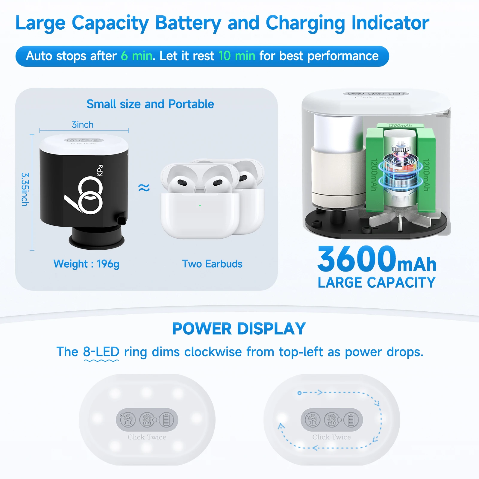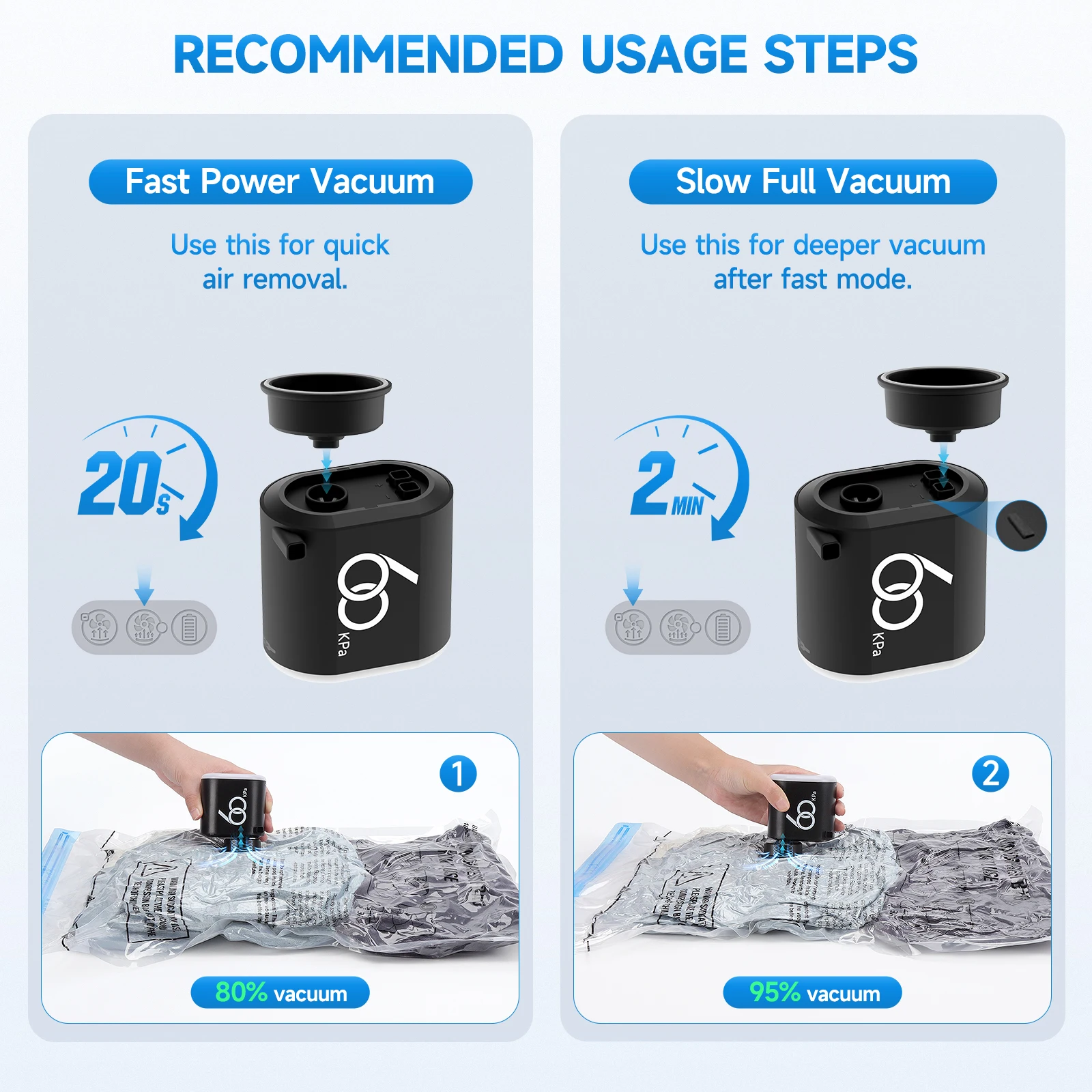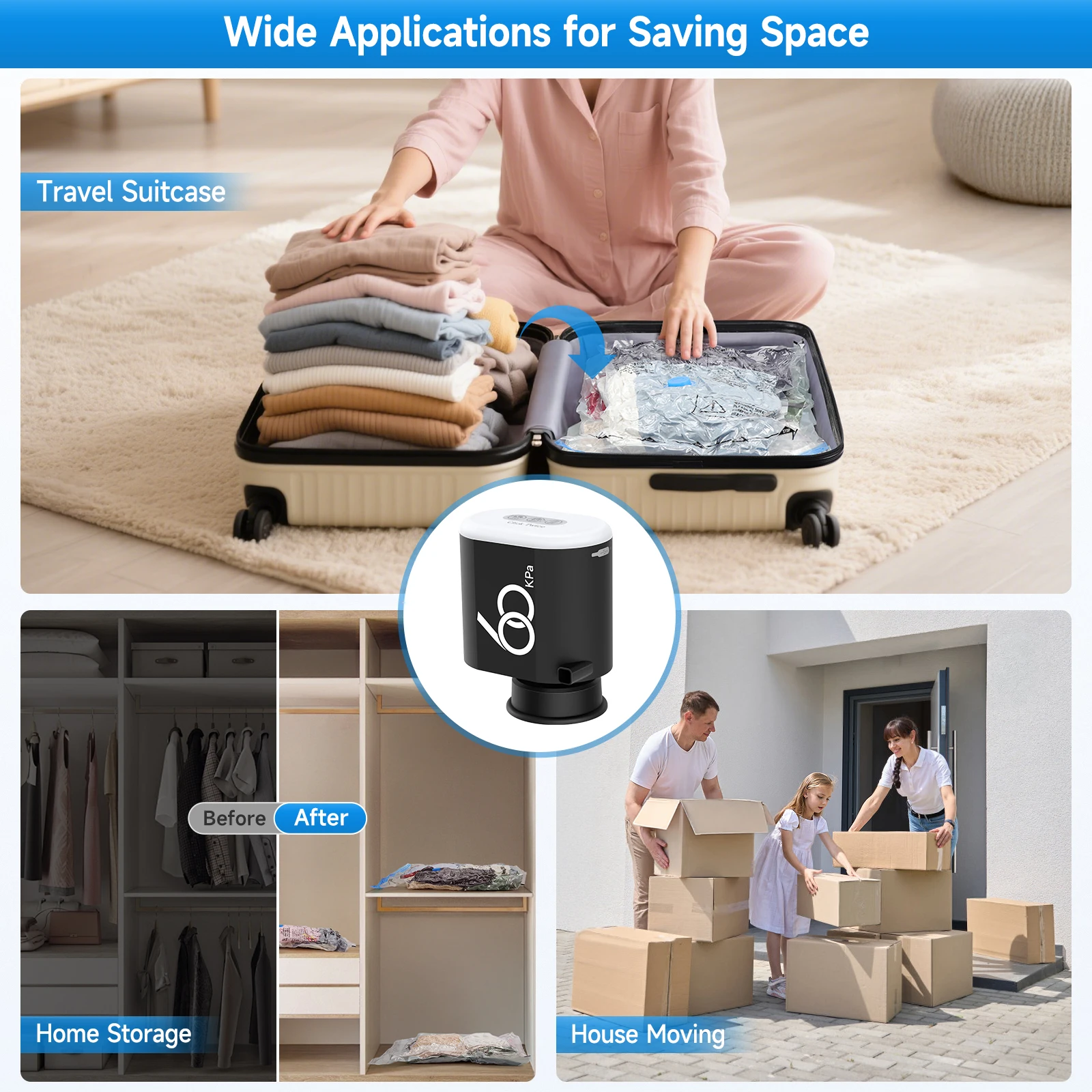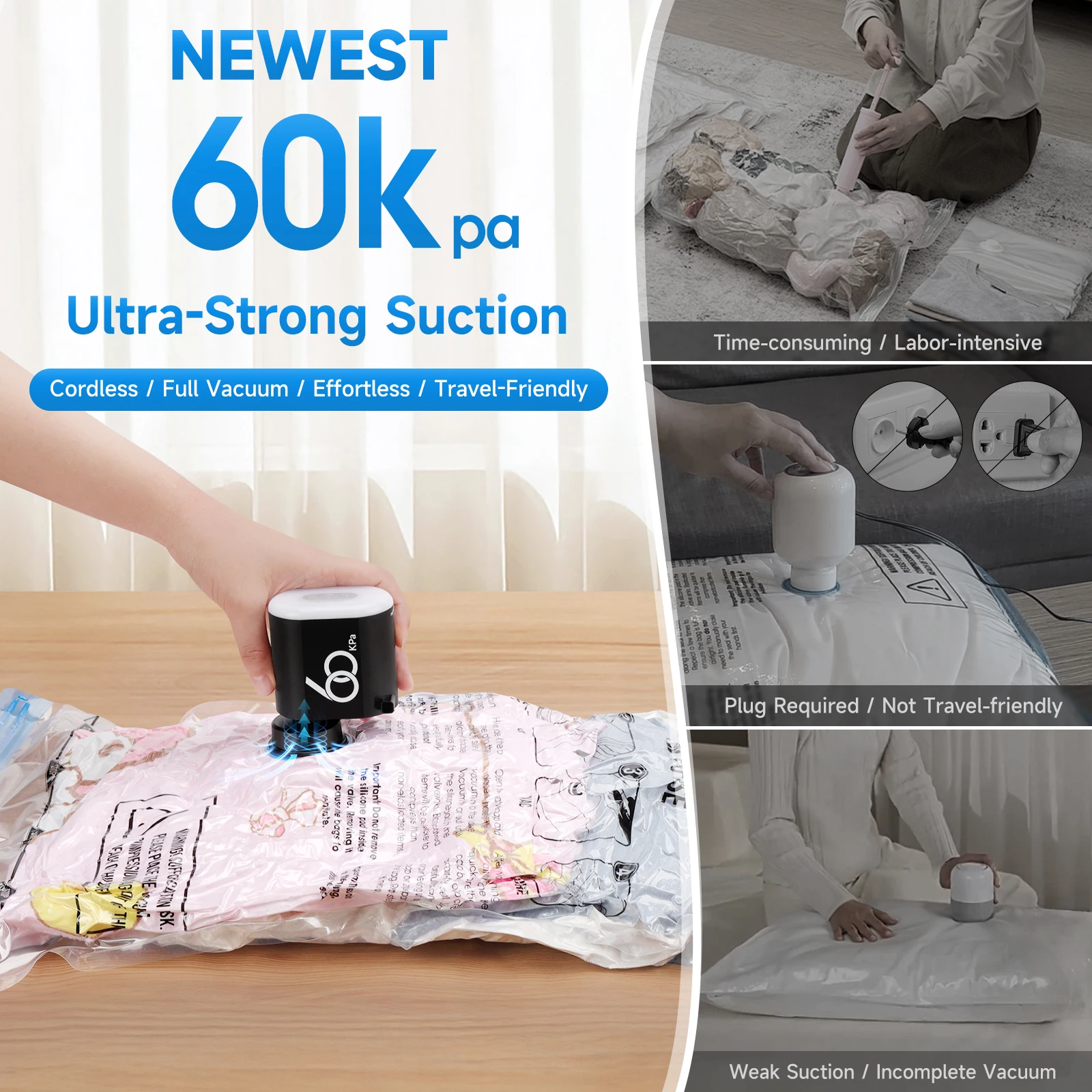 60Kpa Travel 3600mAh Cordless Electric Pump for Vacuum Storage Bags Rechargeable Air Pump Various Seal Space Saver Bag Clothing