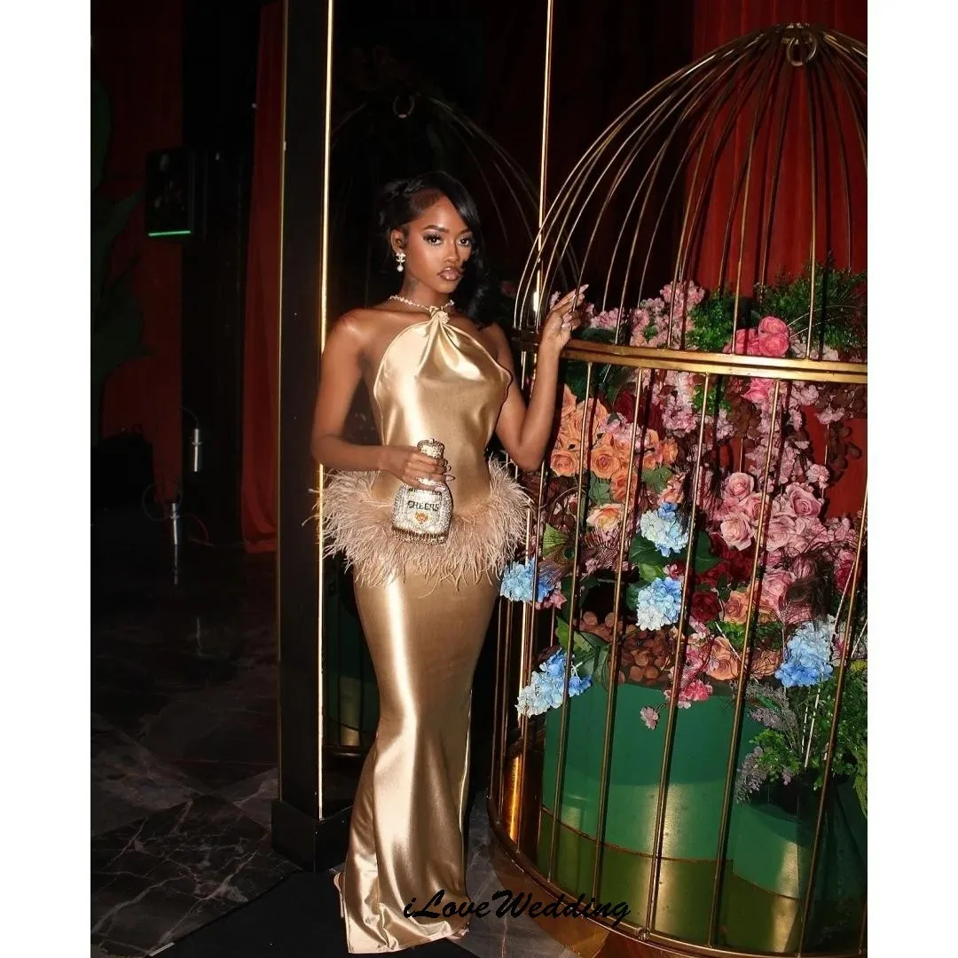 Golden Haler Feather Prom Dress 2025 Satin Elegant Wedding Party Dress Mermaid Sleeveless Evening Dress Floor Length Customized
