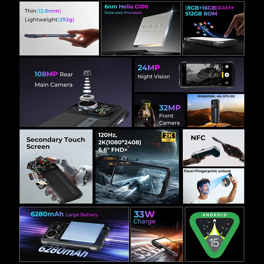 NEW HOTWAV Cyber 16 Pro Rugged Phone Helio G100 4G Octa-core 24GB RAM+512GB ROM 6.6'' 2K 120Hz 6280mAh 33W Android 15 Smartphone