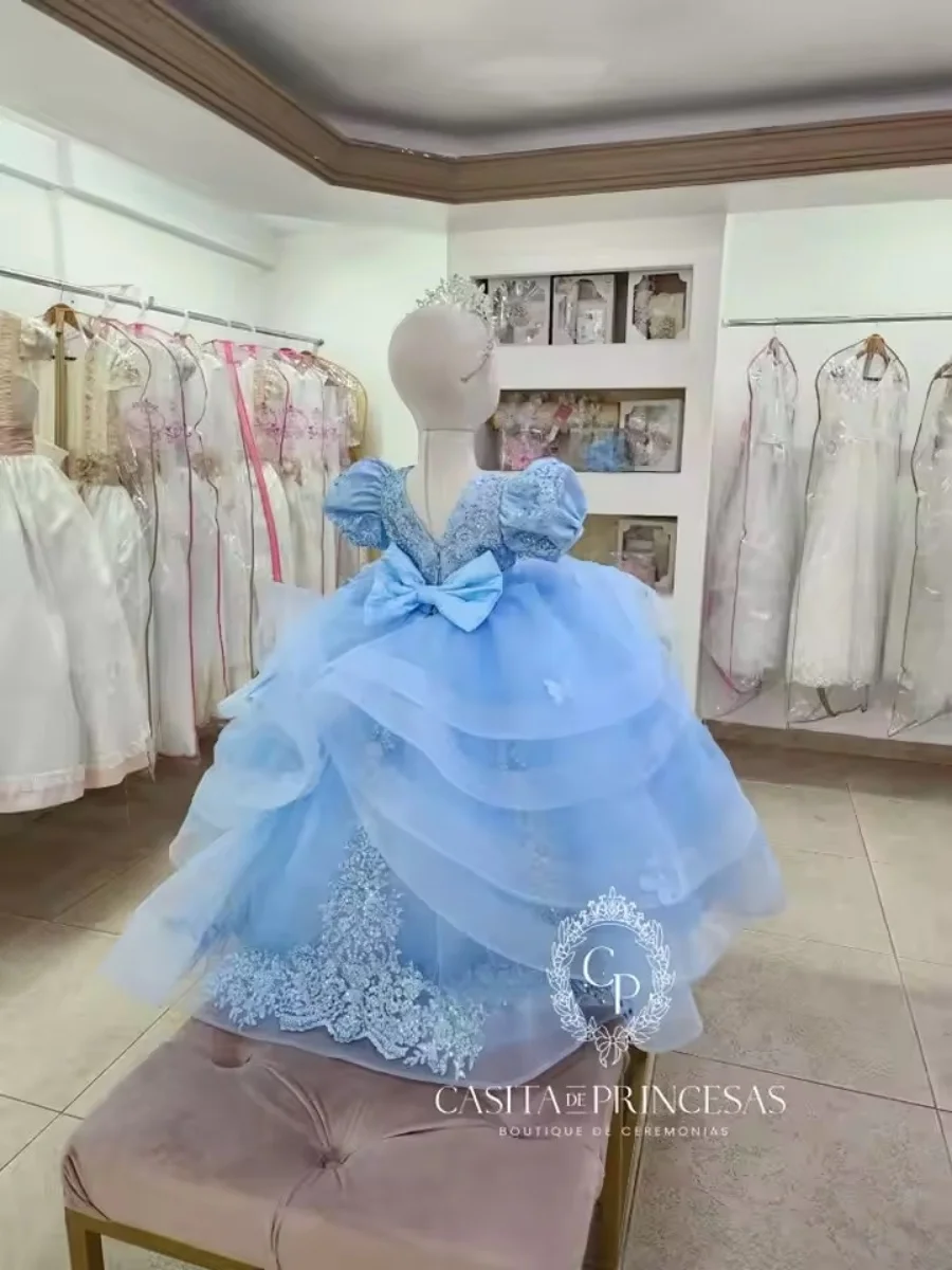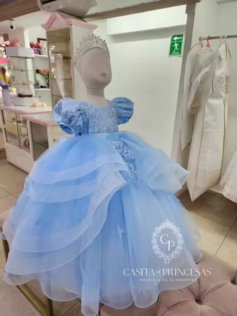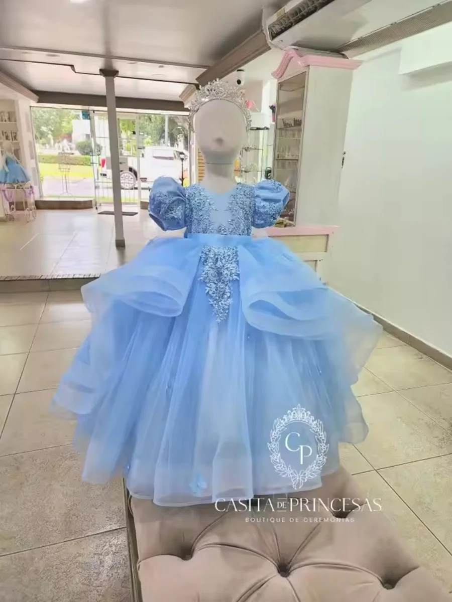 Blue Flower Girl Dresses For Wedding With Bow Lace Appliques Princess Girl Birthday Ball Gowns First Communion Gowns Customized
