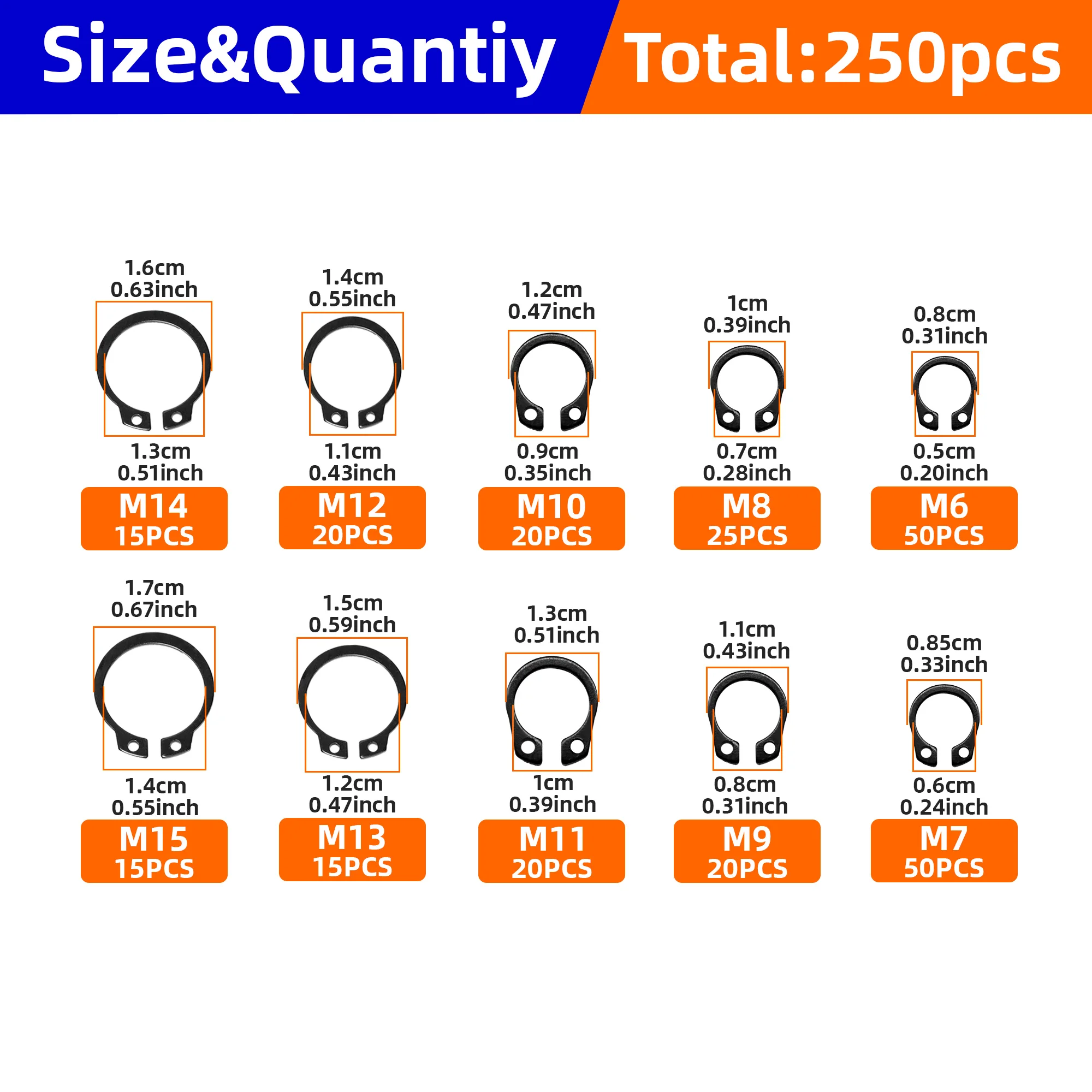 250pcs Assortment Kit Set M6 to M15 Black 65mn Shaft Bearing Retaining Clip Snap Ring C Type External Circlip