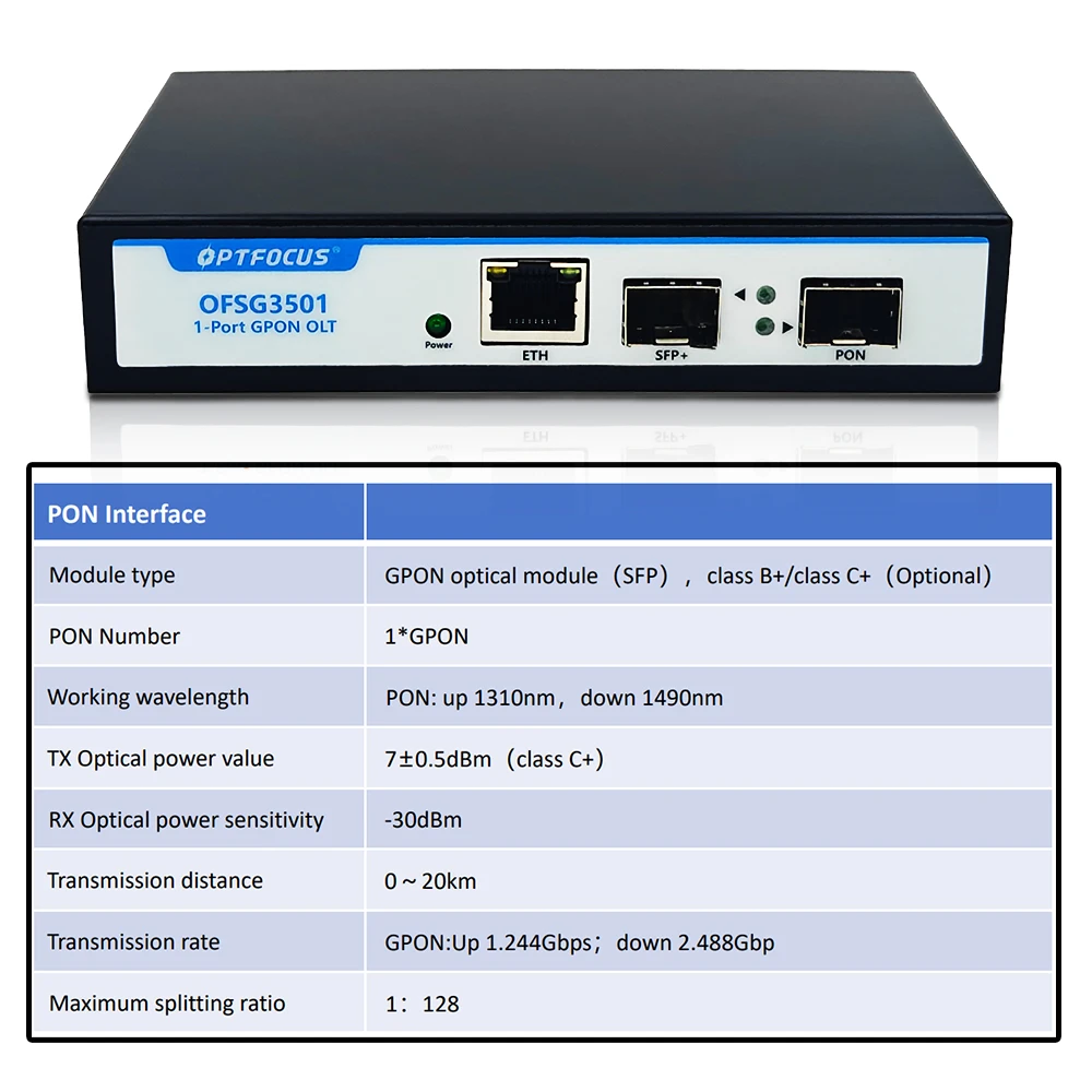 OPTFOCUS Mini GPON OLT 1PON VLAN 10G Uplink 12V 2A DC Power Support 128 ONU POE Power Supply MINI GPON OLT 1 Port