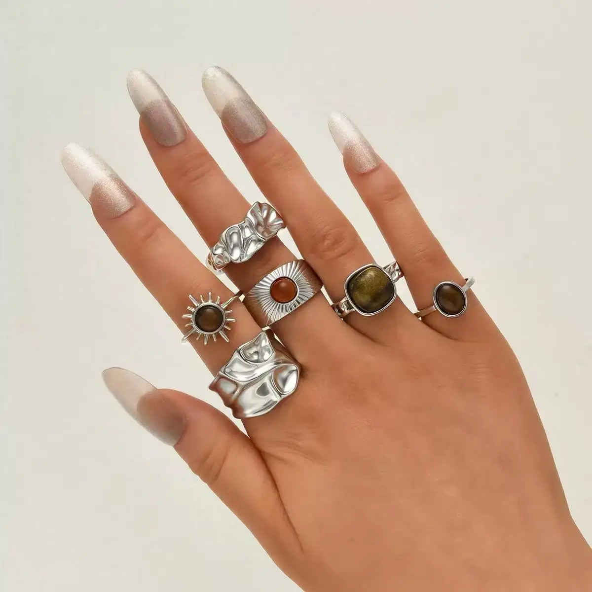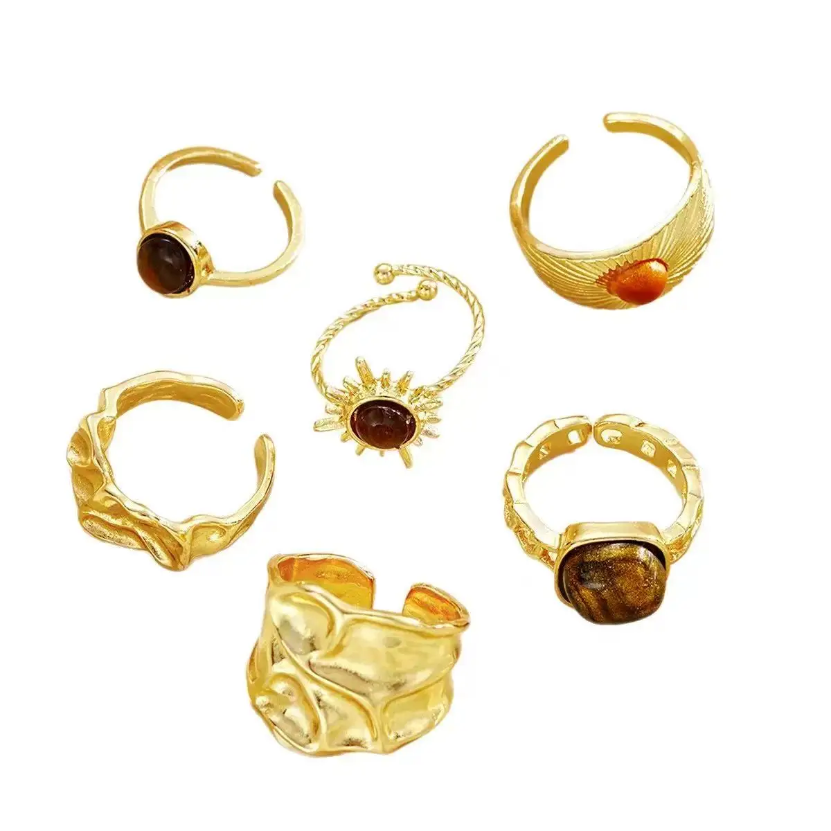 aliexpress , ali , shop , ali shop , online , store , online shop , online store , buy , sell , 6pcs Set Vintage Gold Color Imitation Tiger Eye Aesthetic Rings For Women Irregular Round Sun Ring Set Statement Jewelry Gifts