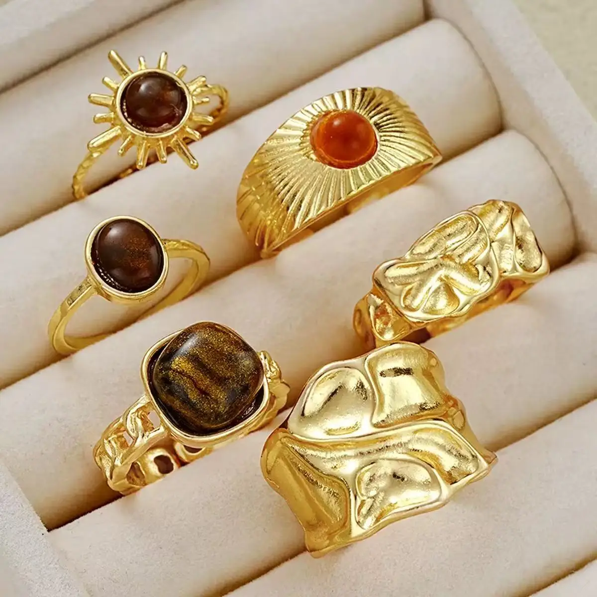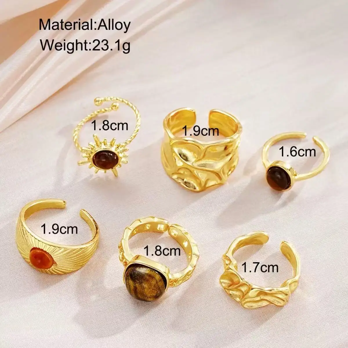 6pcs Set Vintage Gold Color Imitation Tiger Eye Aesthetic Rings For Women Irregular Round Sun Ring Set Statement Jewelry Gifts
