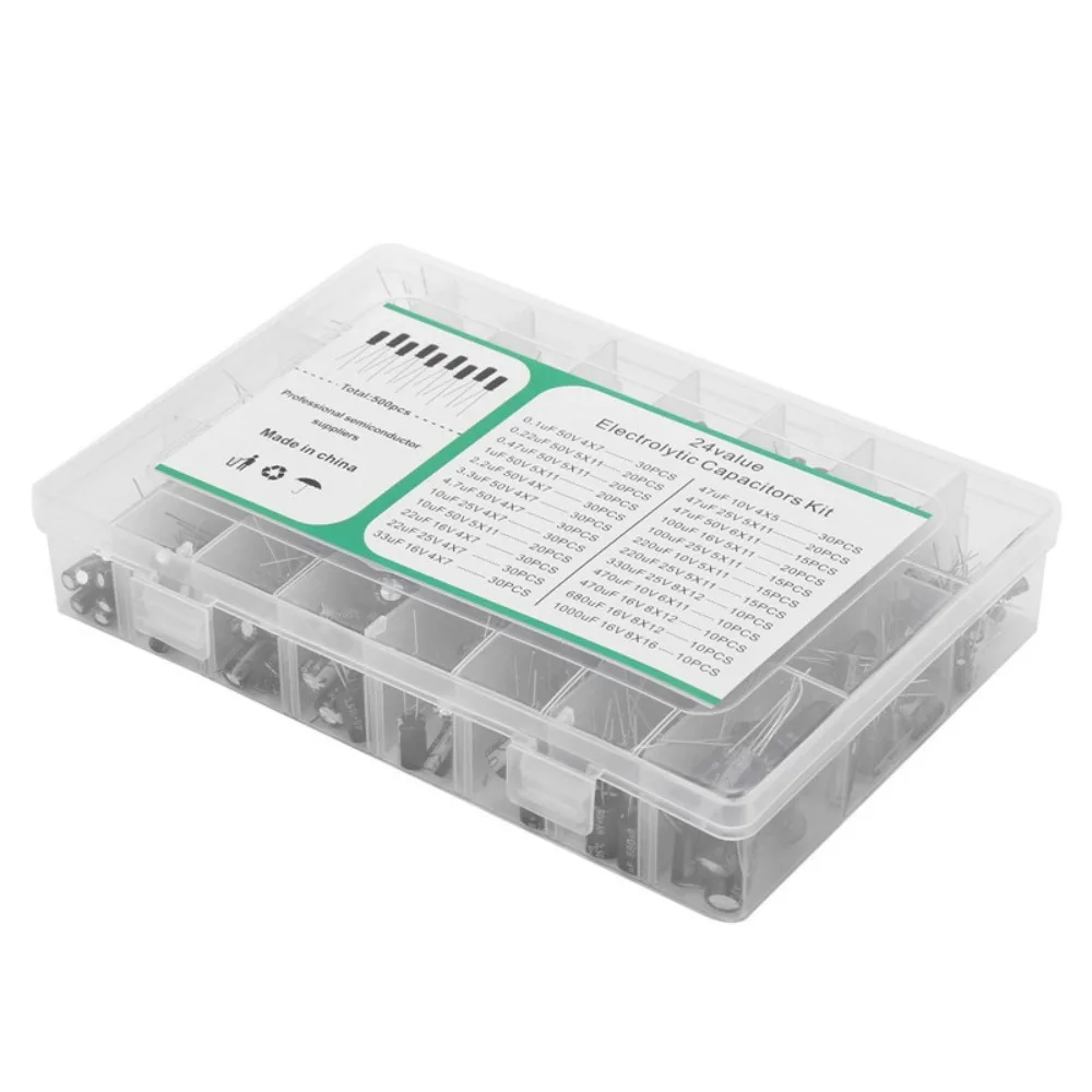 500PCS Direct Insertion Electrolytic Capacitor Sample Kit 0.1uF-1000uF 16V-50V 24 Specifications High Quality Stable Reliable
