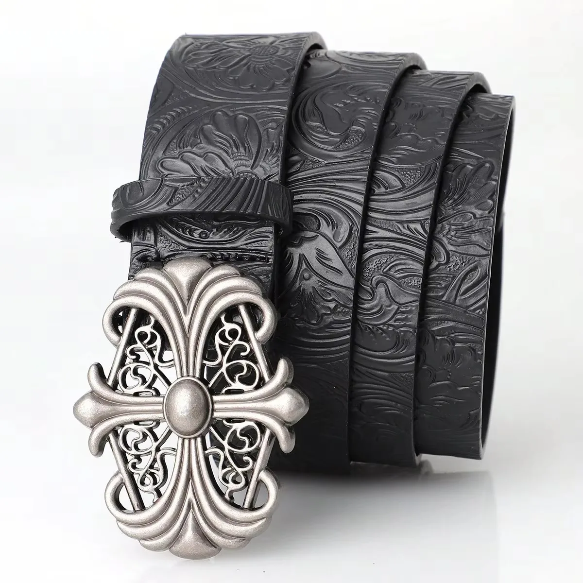 Retro Men's Belt Bohemian Style-Chic Black PU Leather Belt Fashion Vintage Hollow Buckle Belts Punk Rock Y2K Style,For Men Women